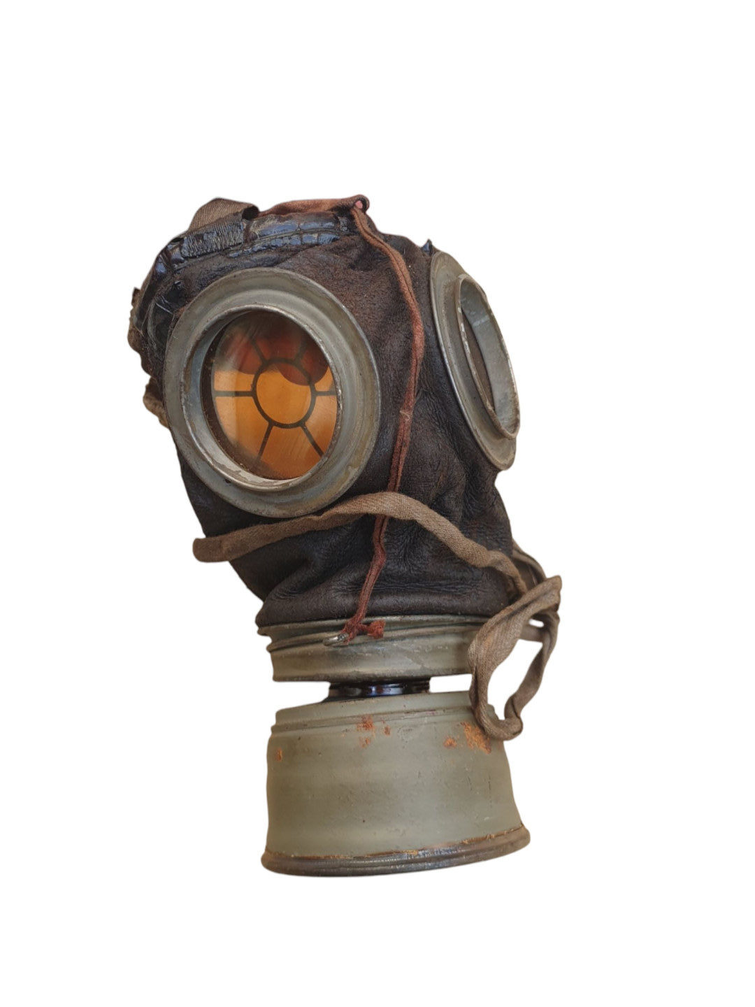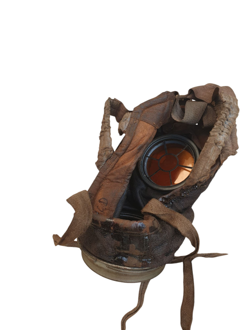 Nice and strong German WWI Gas-mask can, box is nicely named to an MG unit, the mask is perfect, the instruction label well at the bottom of the can. The filter lightly rusted but without problem. All straps present on the can, they are getting hard to get in this condition!