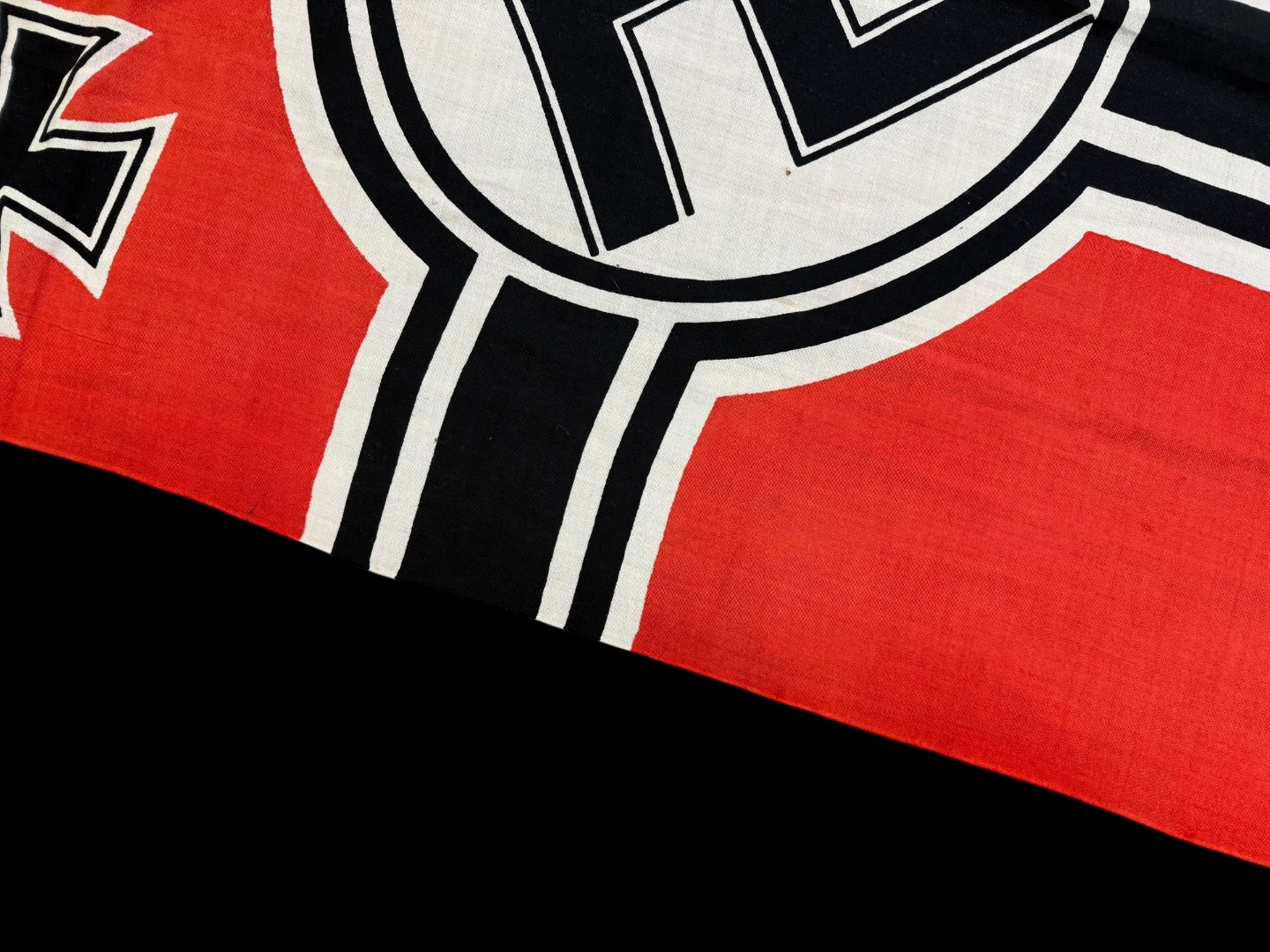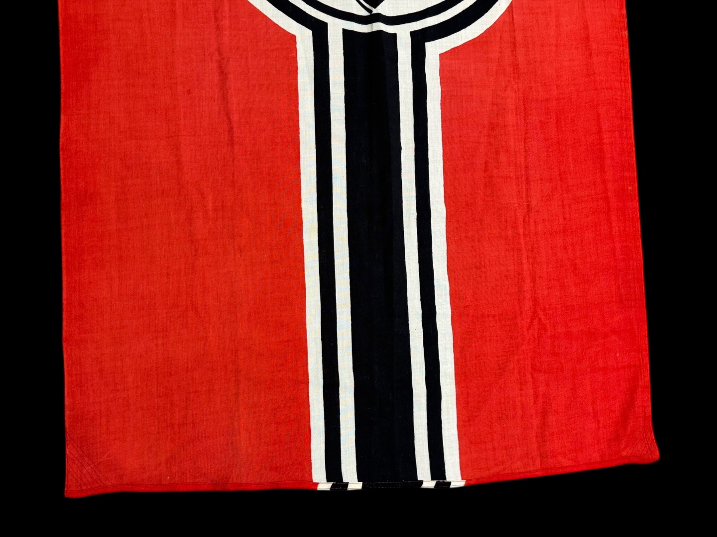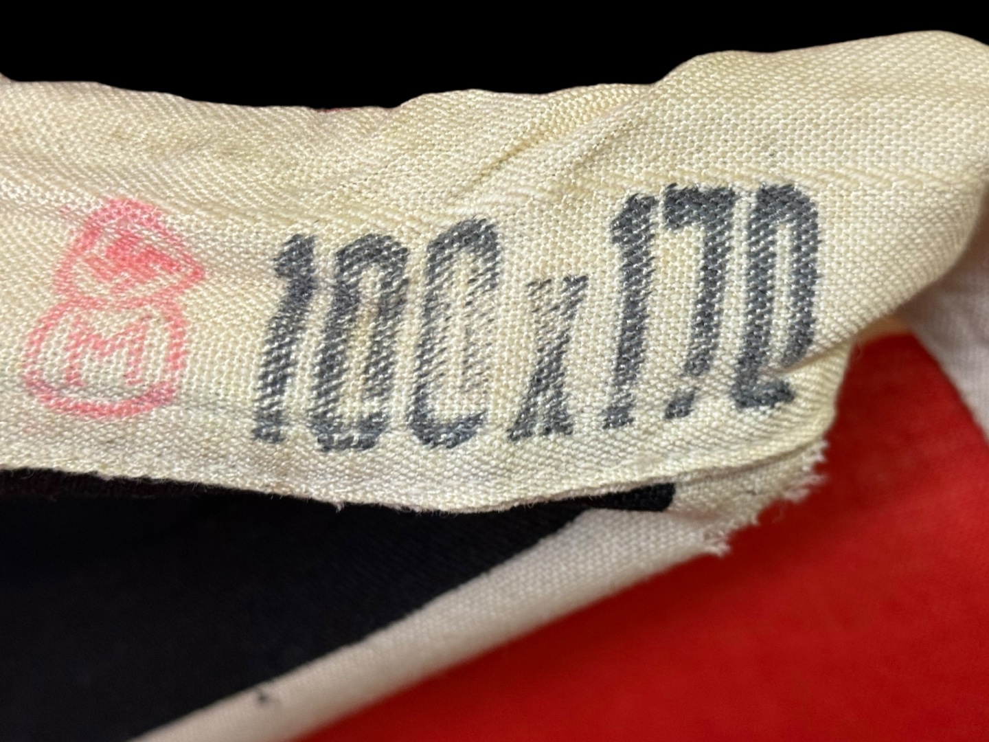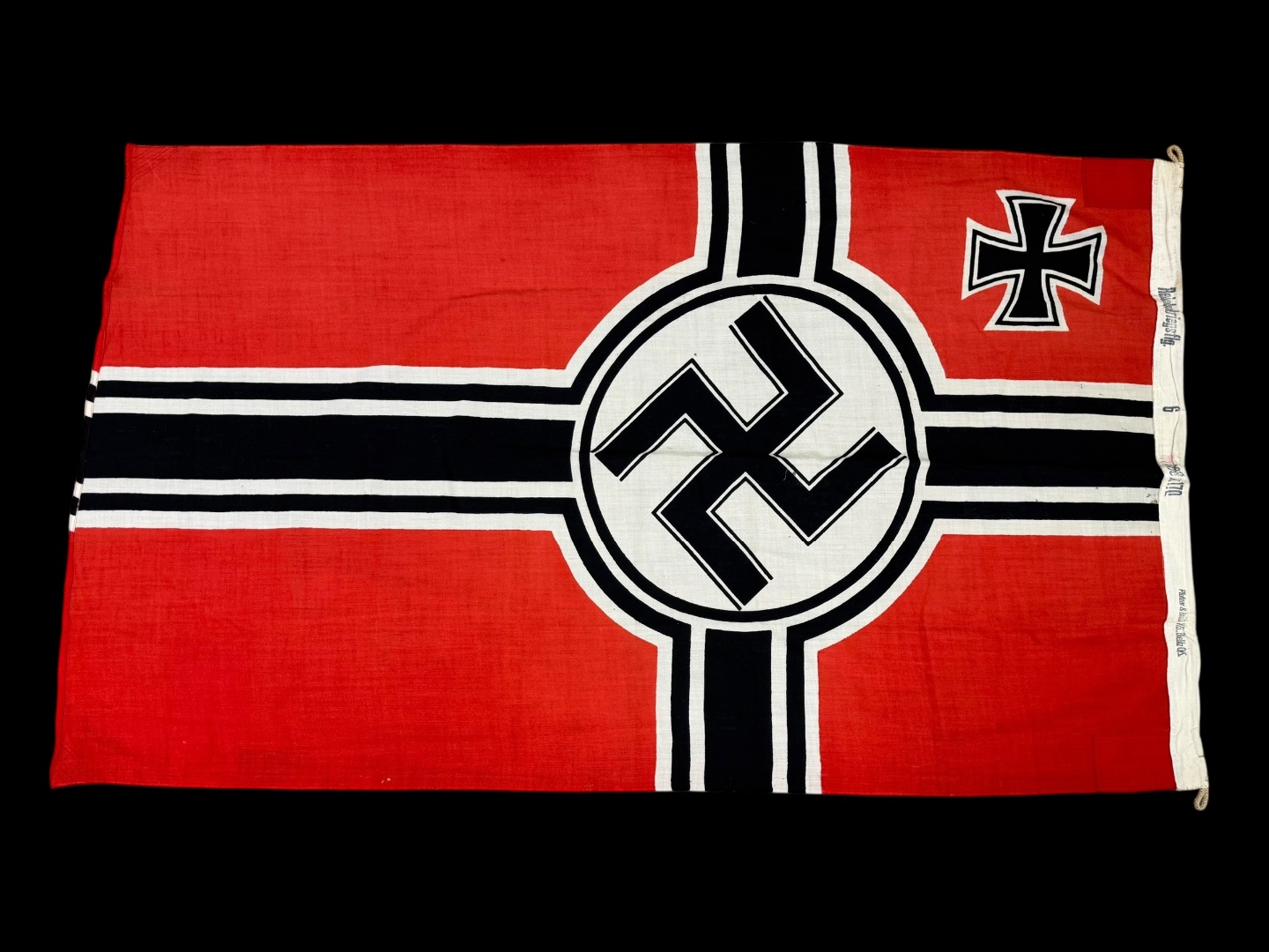 For sale is a Kriegsmarine “M” marked kriegsflag measuring 100x170cm. Screen printed cotton. High condition, few small holes barely noticable when looking at the flag broadly, colors are vibrant, ink stamps are clearly legible. Light to no soiling. Good clean battle flag in a great indoor display size.