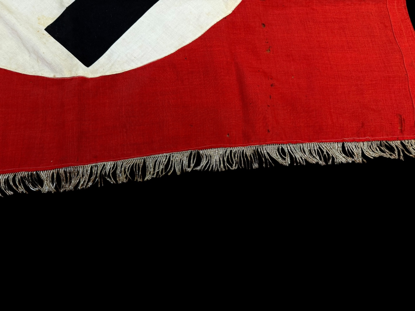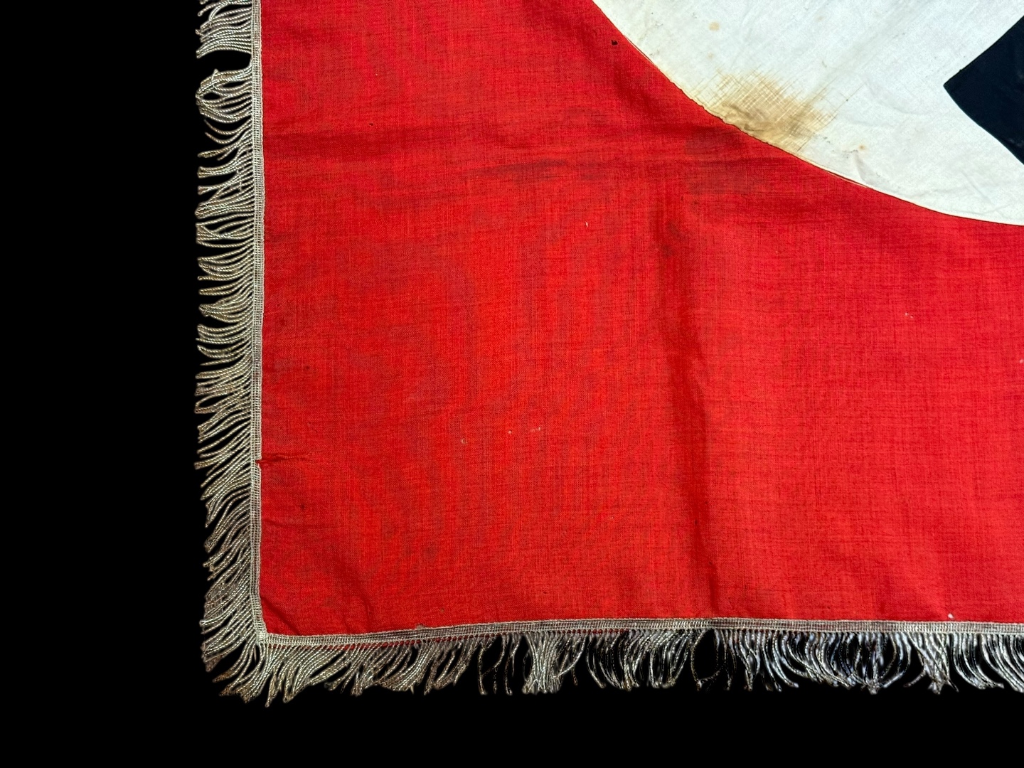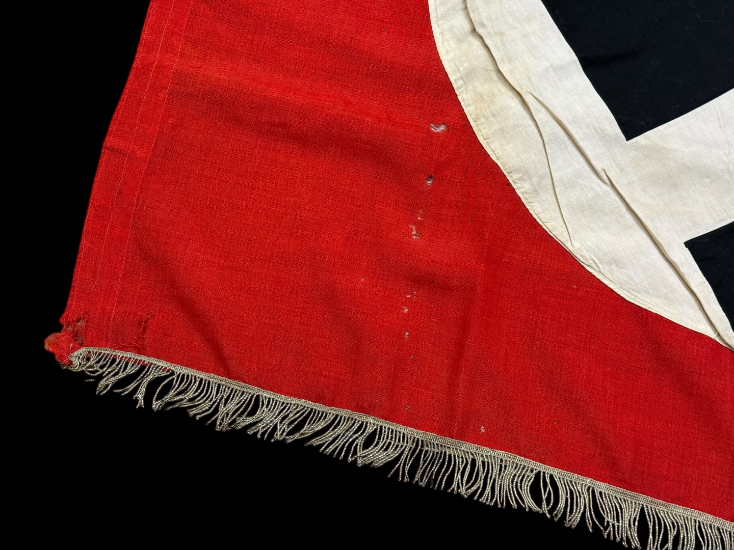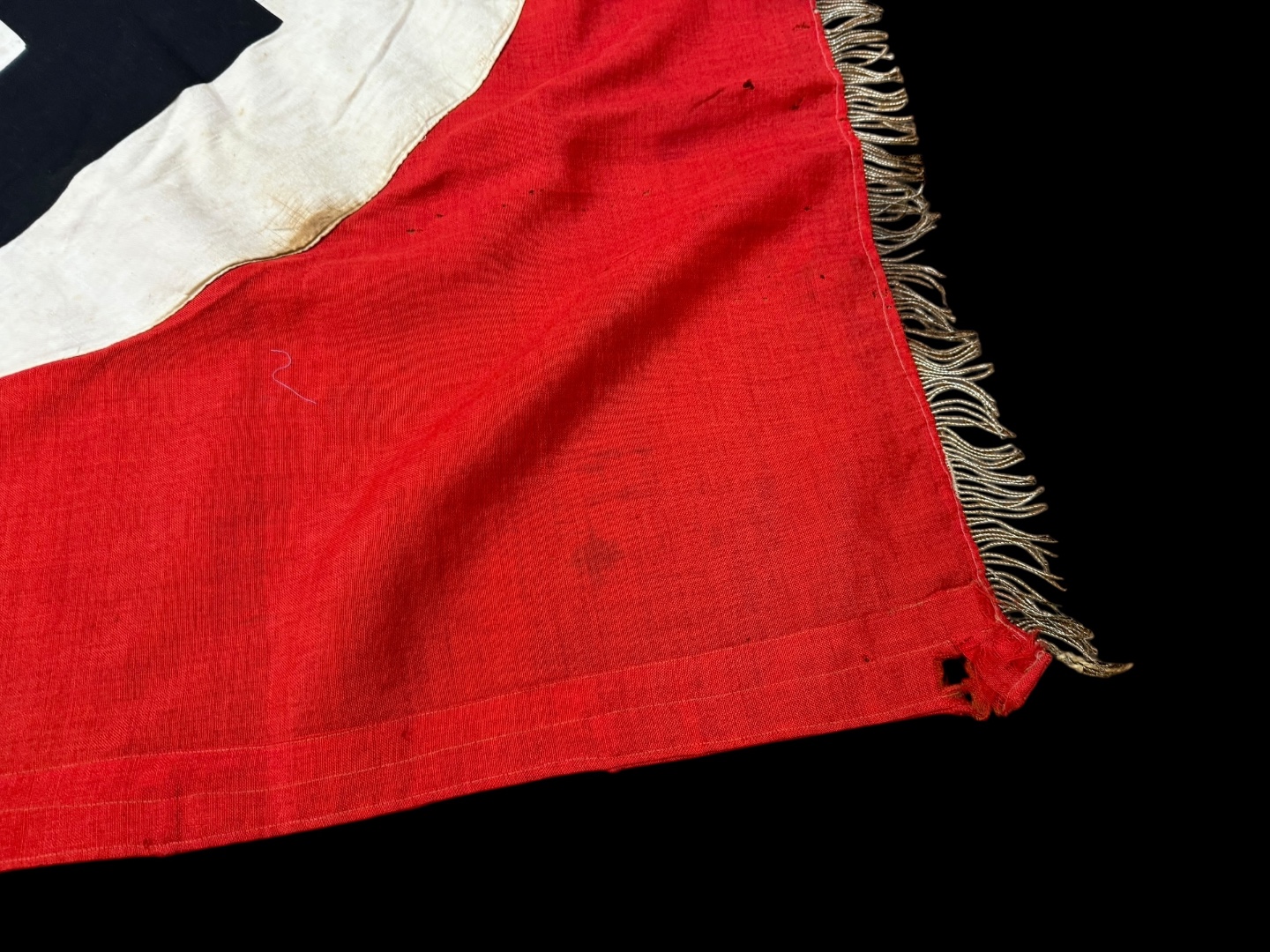 For sale is a Nazi party podium banner flag with gold metallic tassles. The flag measures roughly 45 x 52in, double sided multi piece cotton construction. Flag has a few small moth holes and some soiling on the white roundel in the center. The selvage area, where a rope or poll would go through to suspend the flag, has a hole toward one end but is structurally in tact otherwise. Otherwise no damage or major detractors from this striking display piece.