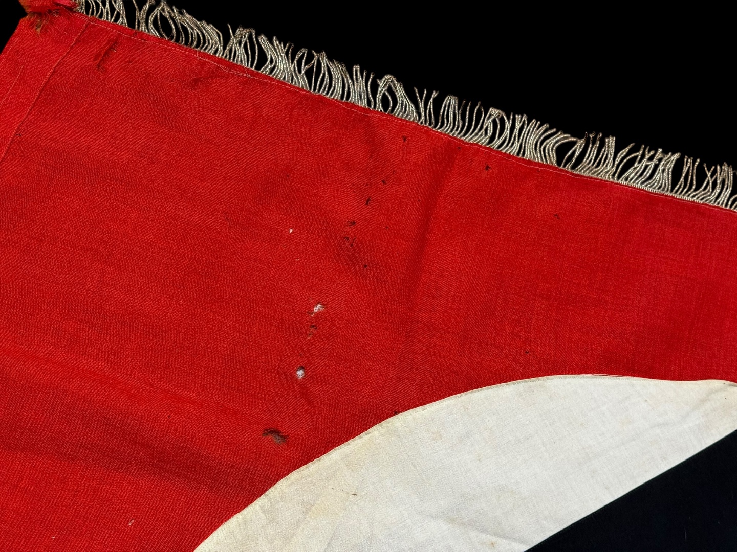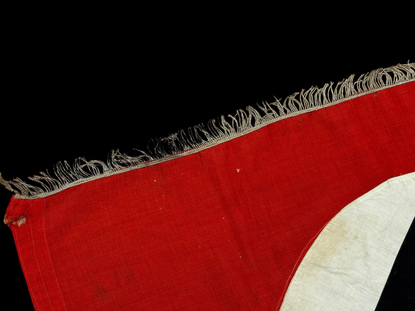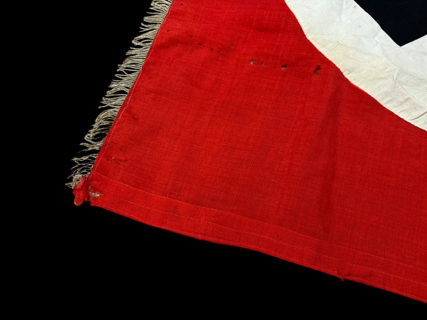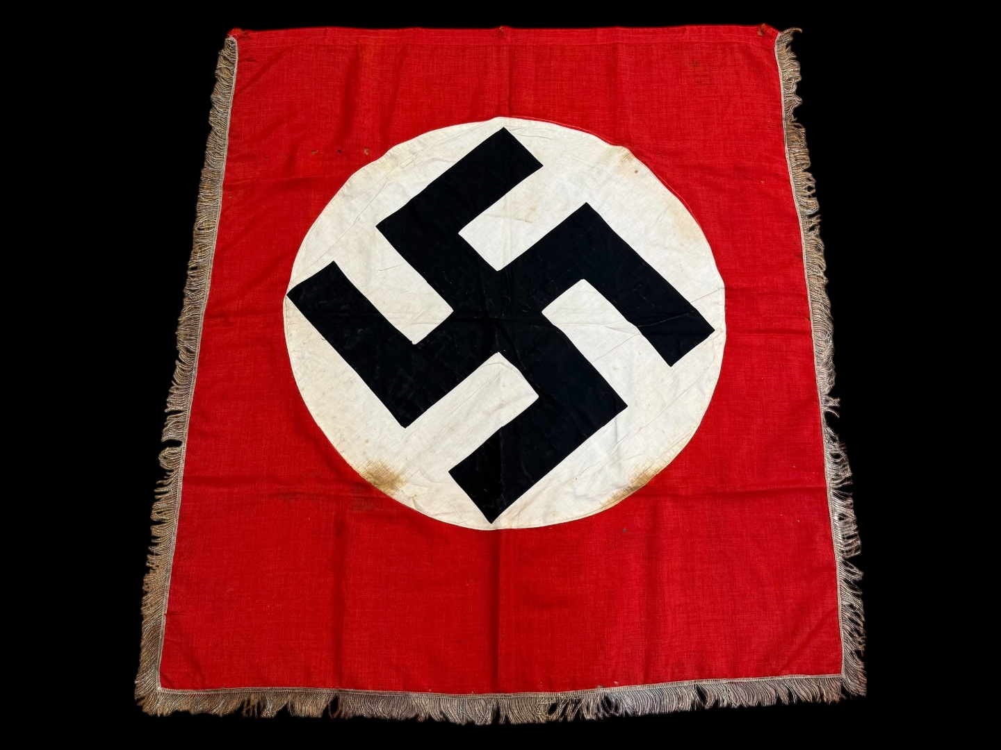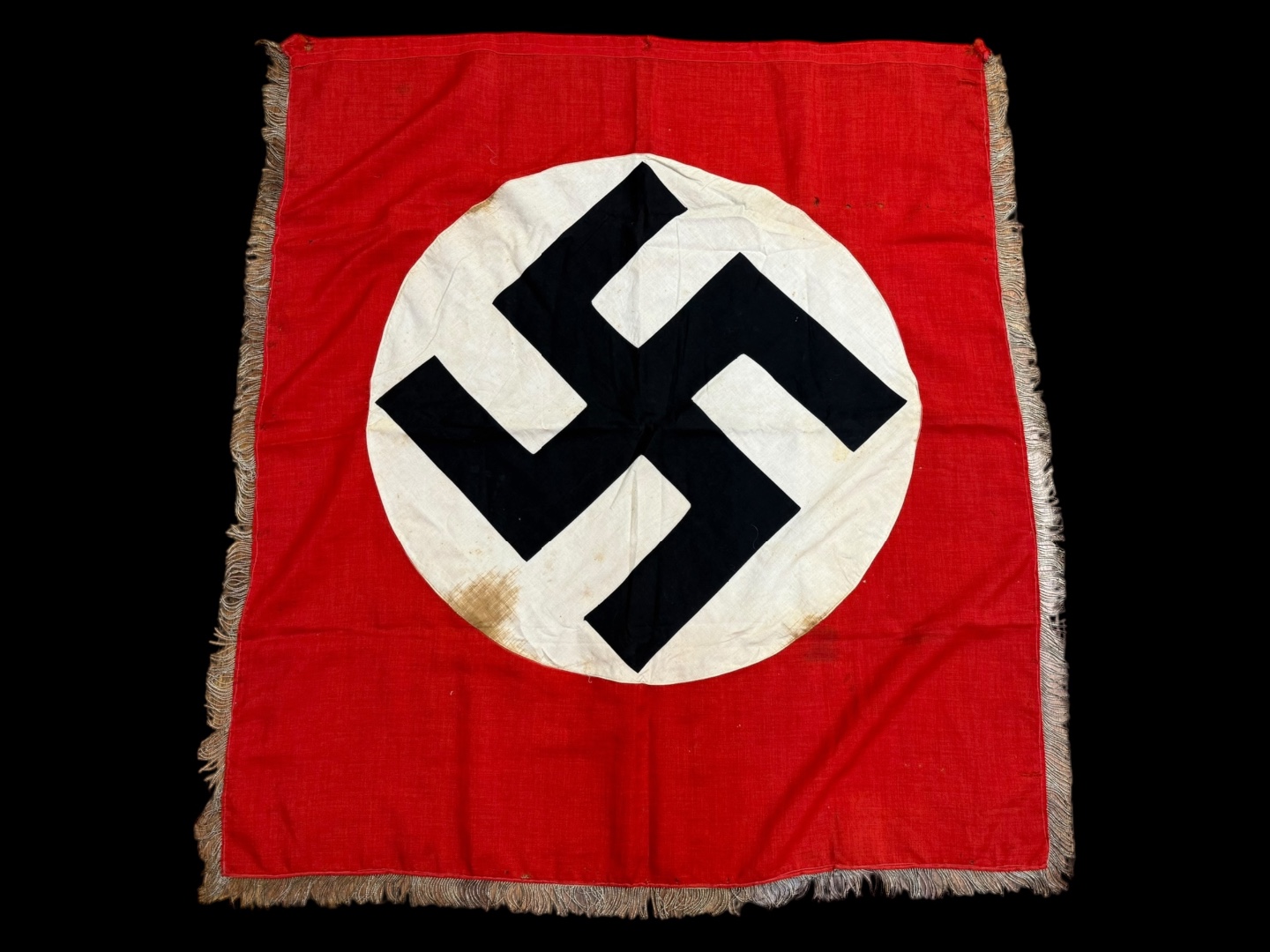 For sale is a Nazi party podium banner flag with gold metallic tassles. The flag measures roughly 45 x 52in, double sided multi piece cotton construction. Flag has a few small moth holes and some soiling on the white roundel in the center. The selvage area, where a rope or poll would go through to suspend the flag, has a hole toward one end but is structurally in tact otherwise. Otherwise no damage or major detractors from this striking display piece.