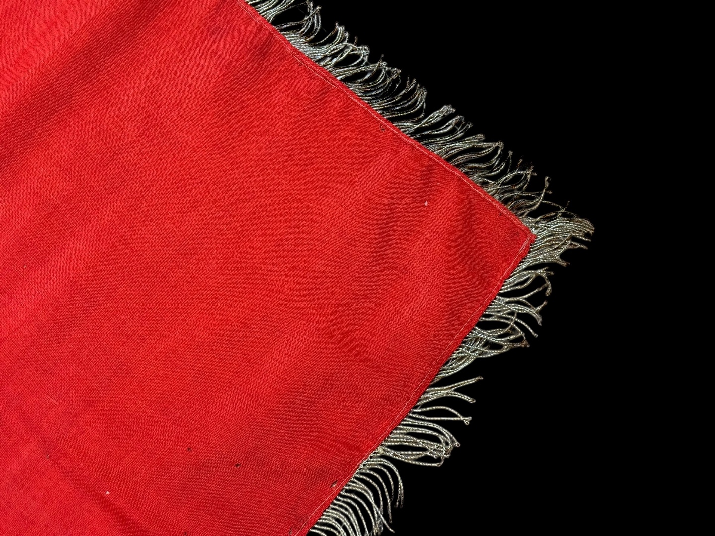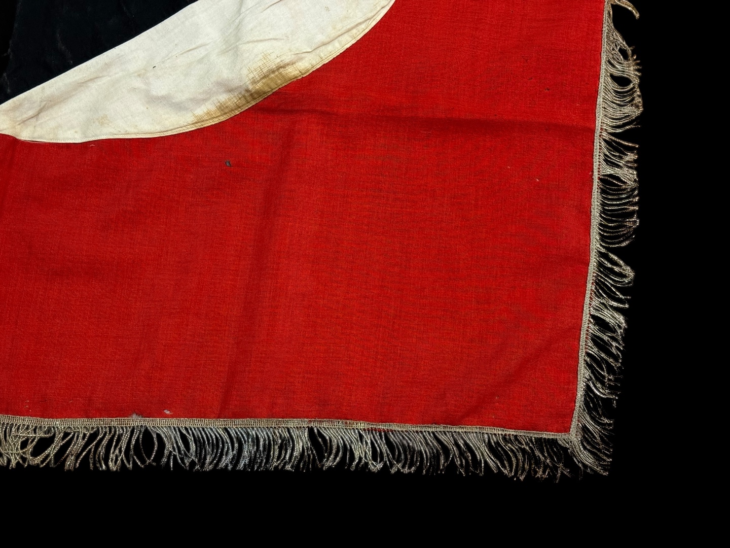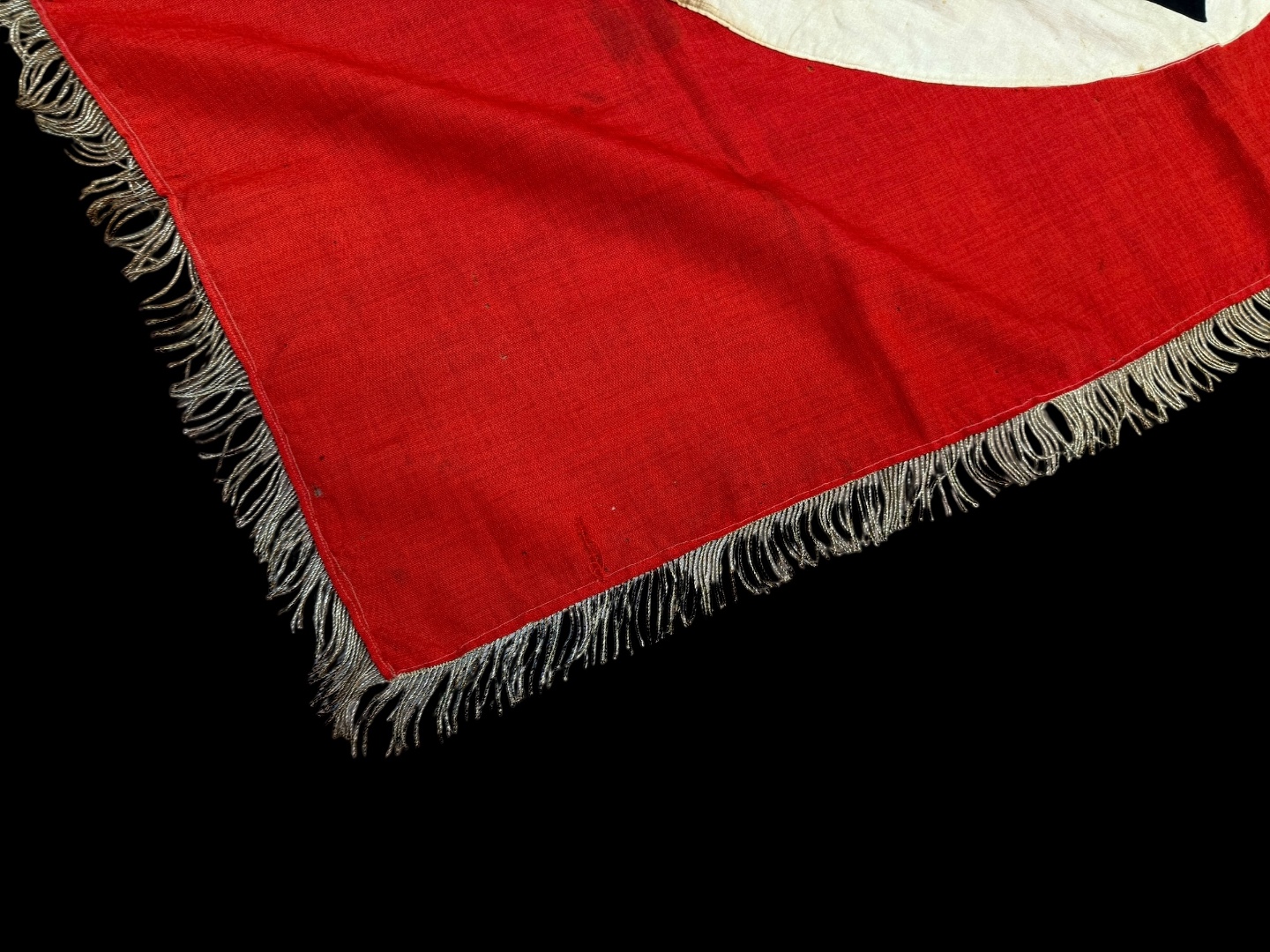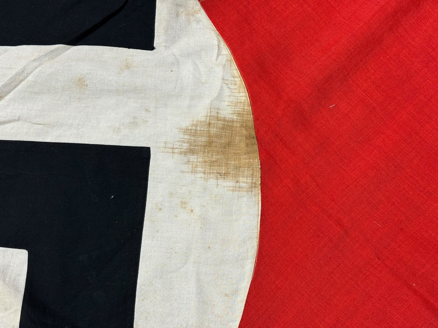 For sale is a Nazi party podium banner flag with gold metallic tassles. The flag measures roughly 45 x 52in, double sided multi piece cotton construction. Flag has a few small moth holes and some soiling on the white roundel in the center. The selvage area, where a rope or poll would go through to suspend the flag, has a hole toward one end but is structurally in tact otherwise. Otherwise no damage or major detractors from this striking display piece.