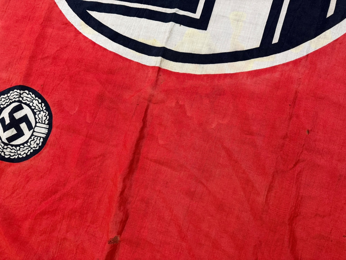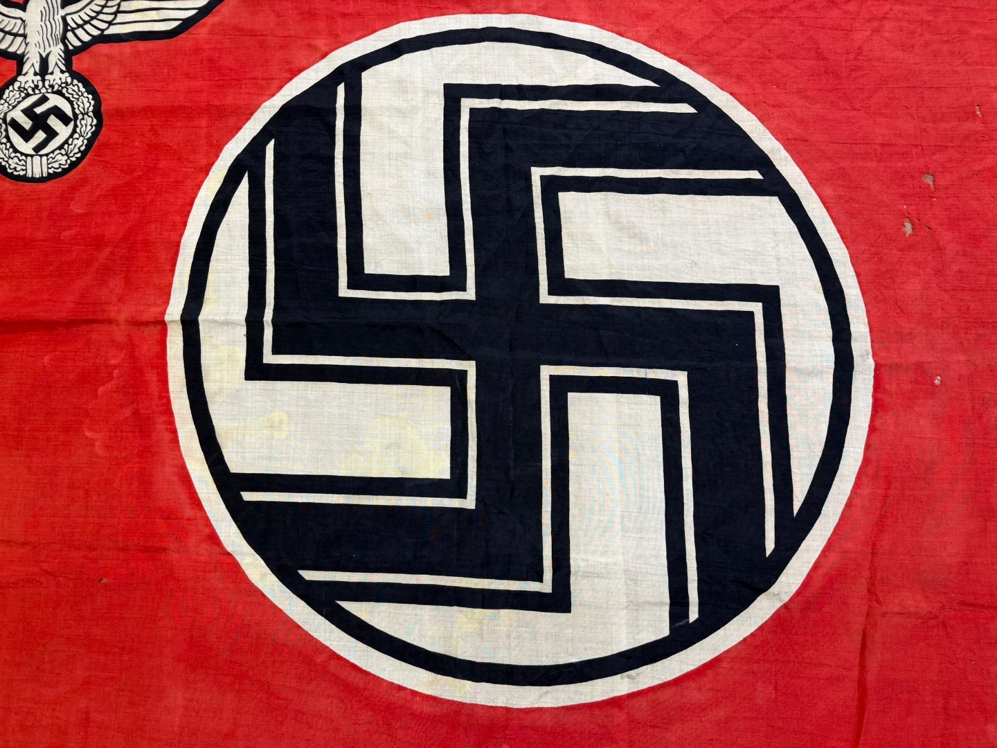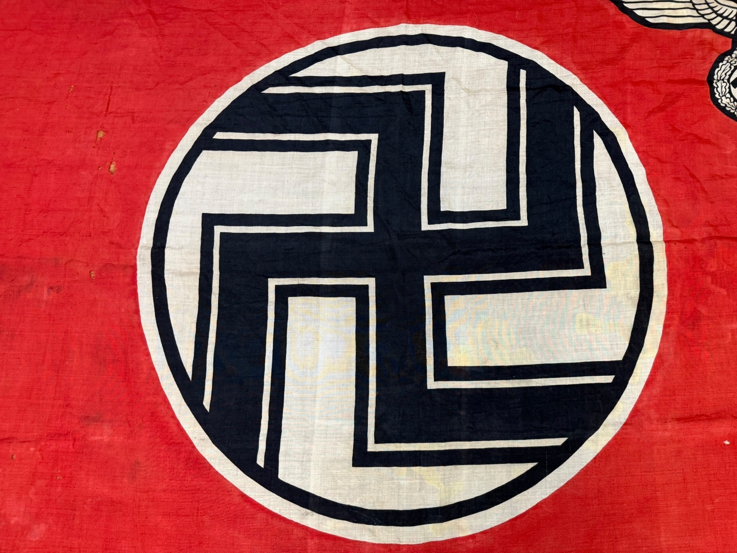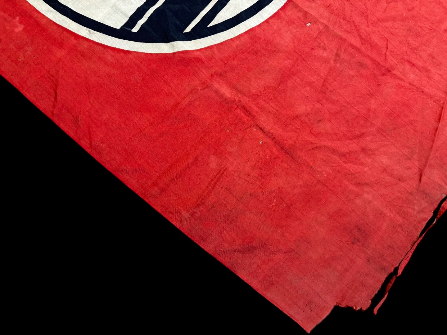 For sale is a tattered Nazi state service flag. Measures roughly 1.4 x 2.7 meters, no ink stamps or maker marks (not anymore, at least). Screen printed cotton.
