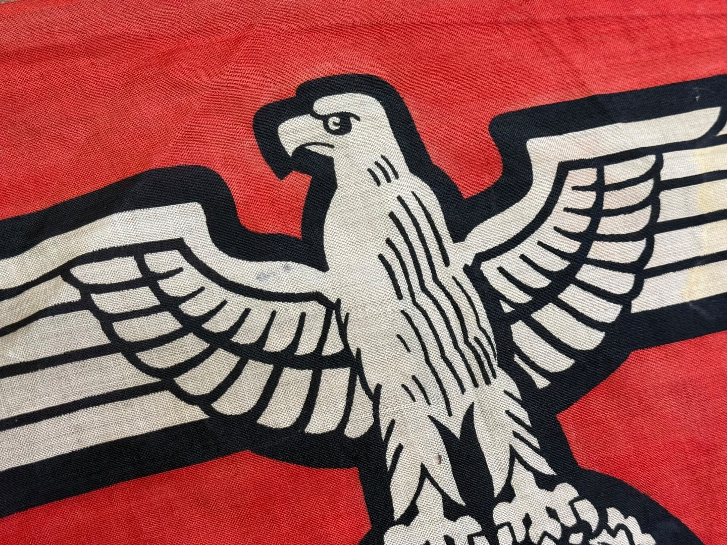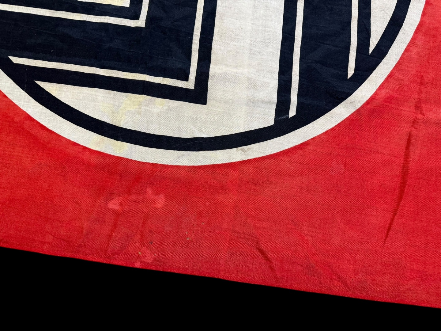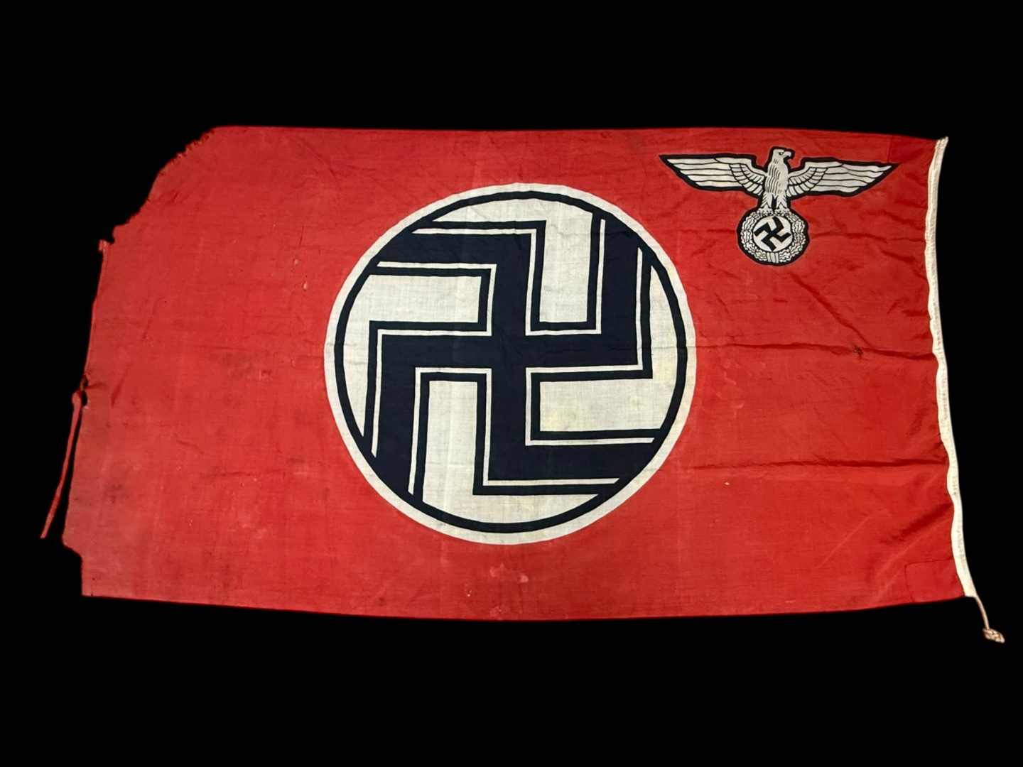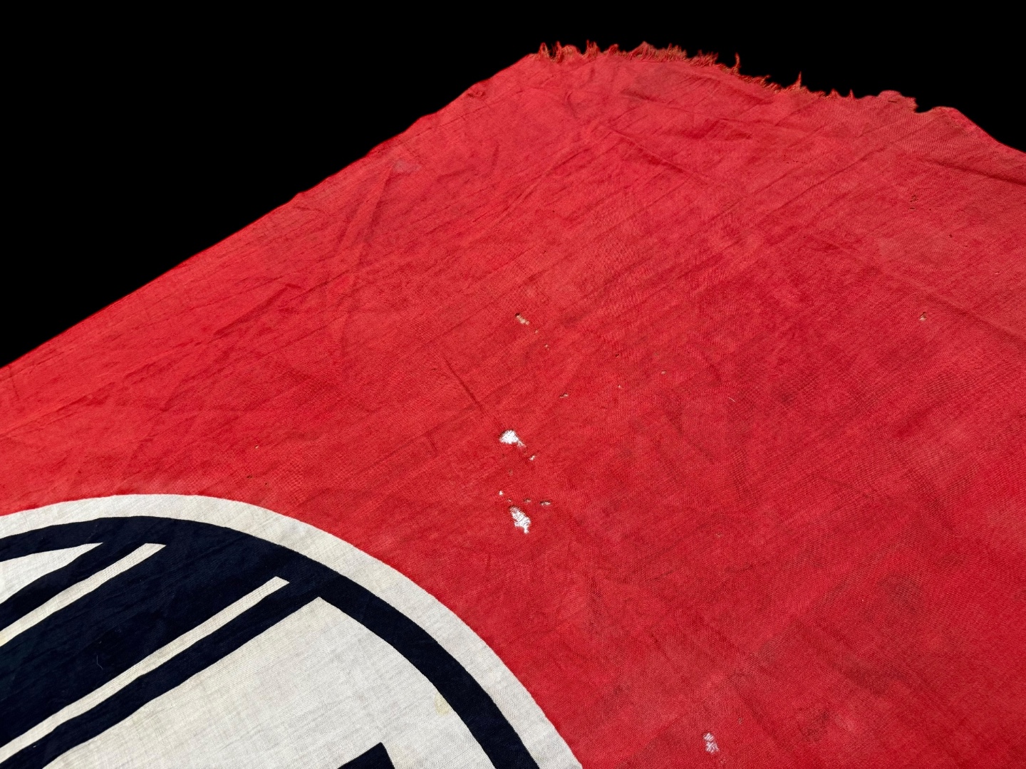 For sale is a tattered Nazi state service flag. Measures roughly 1.4 x 2.7 meters, no ink stamps or maker marks (not anymore, at least). Screen printed cotton.