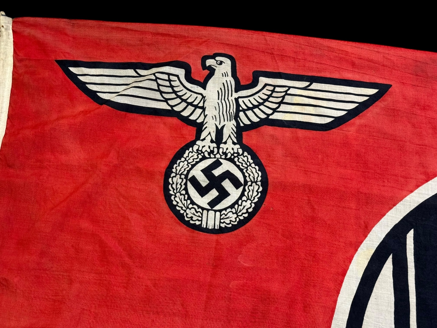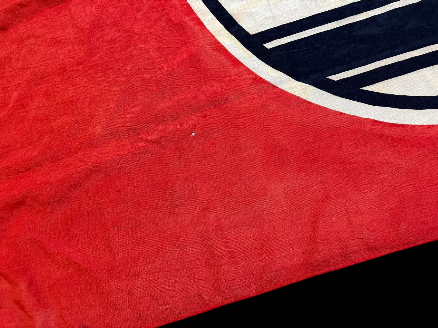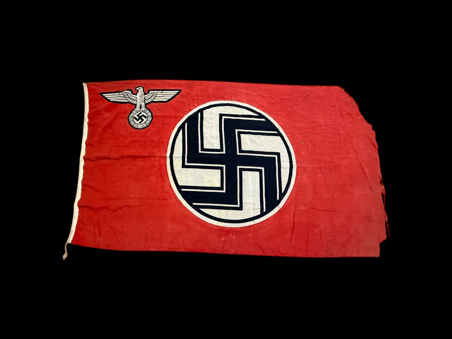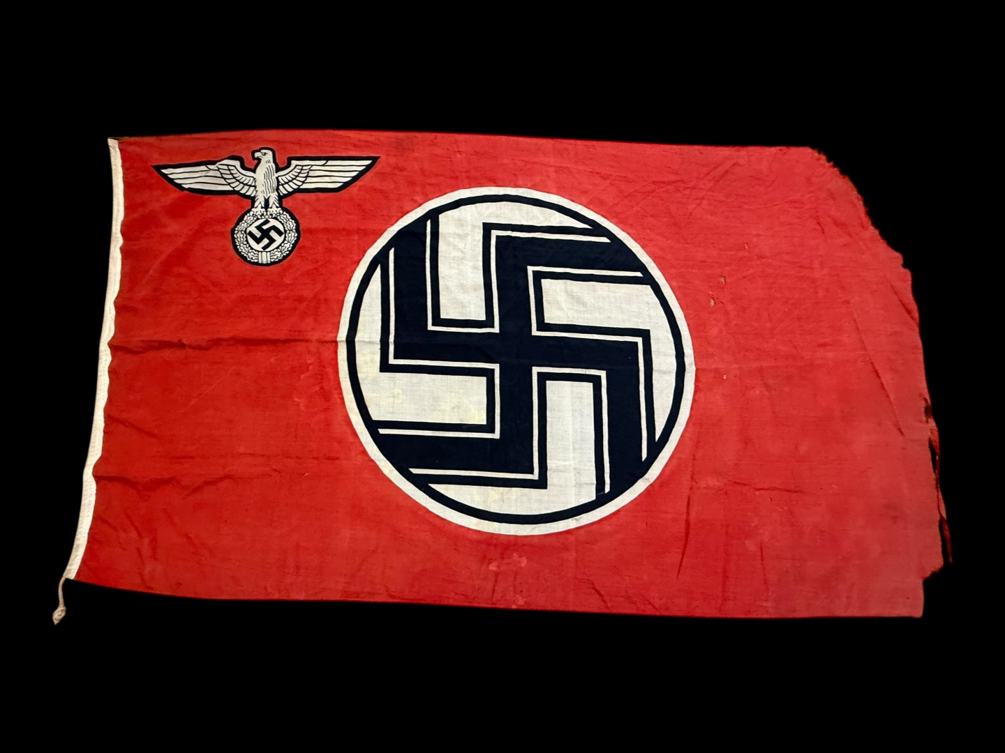 For sale is a tattered Nazi state service flag. Measures roughly 1.4 x 2.7 meters, no ink stamps or maker marks (not anymore, at least). Screen printed cotton.