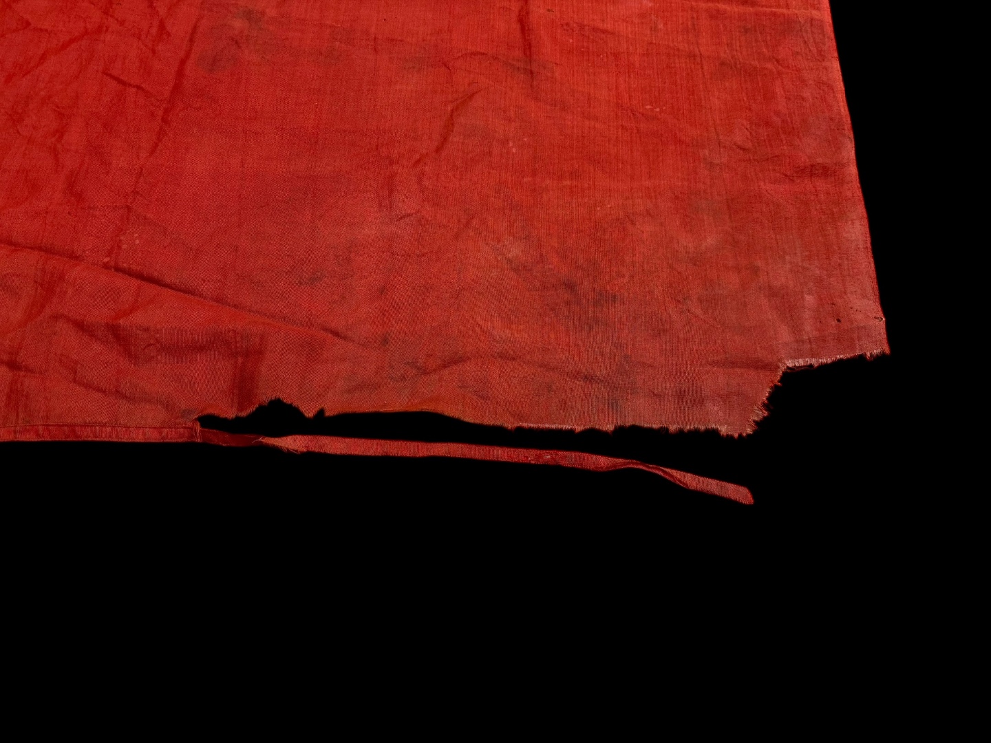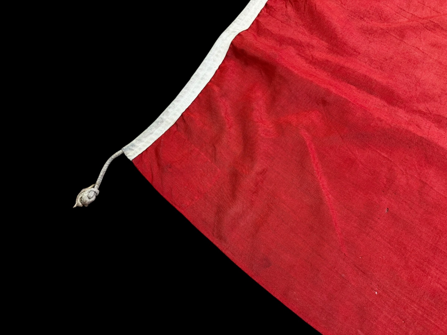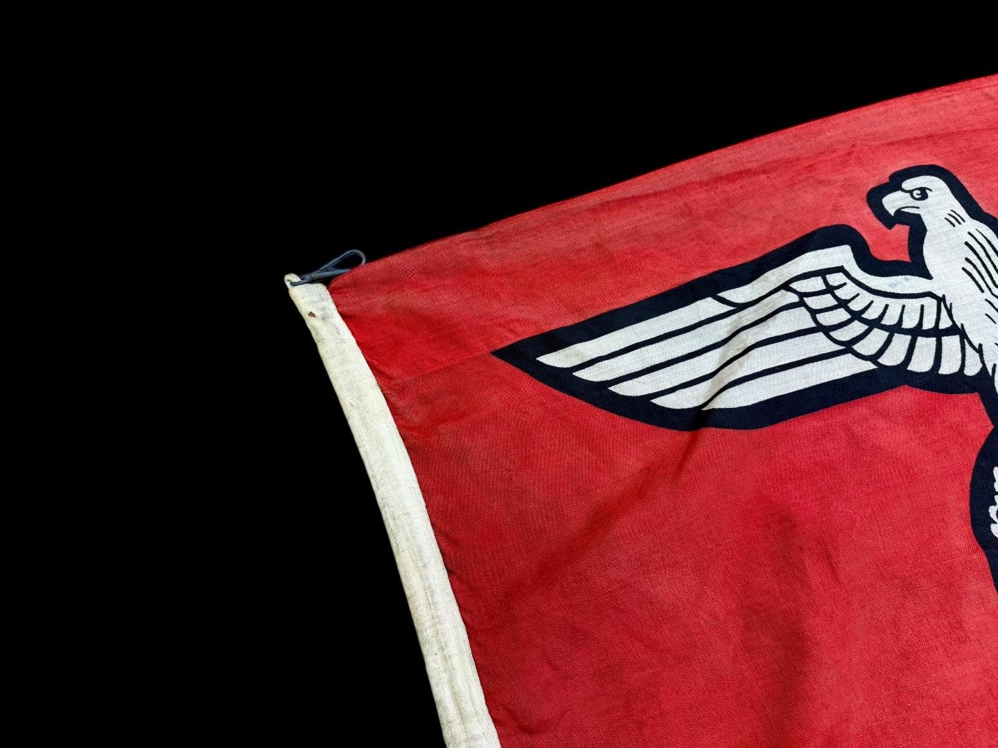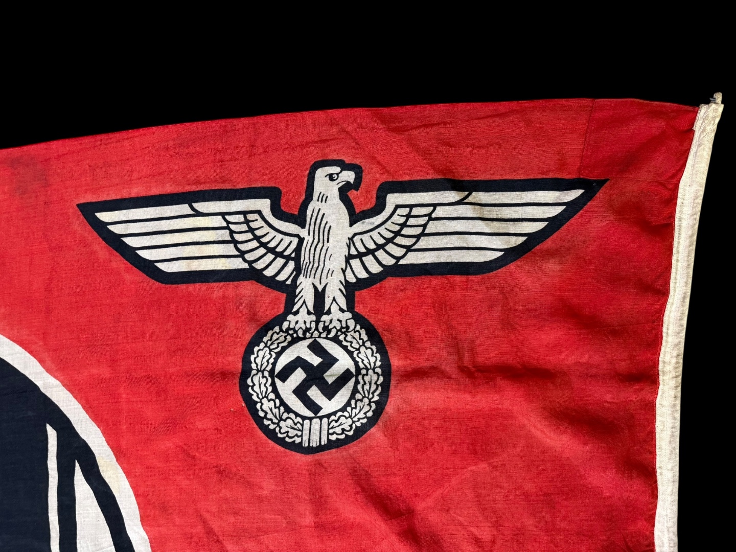 For sale is a tattered Nazi state service flag. Measures roughly 1.4 x 2.7 meters, no ink stamps or maker marks (not anymore, at least). Screen printed cotton.