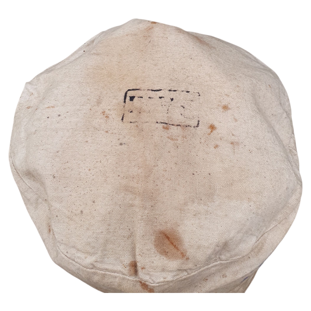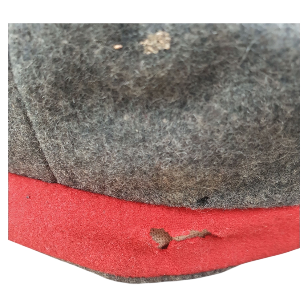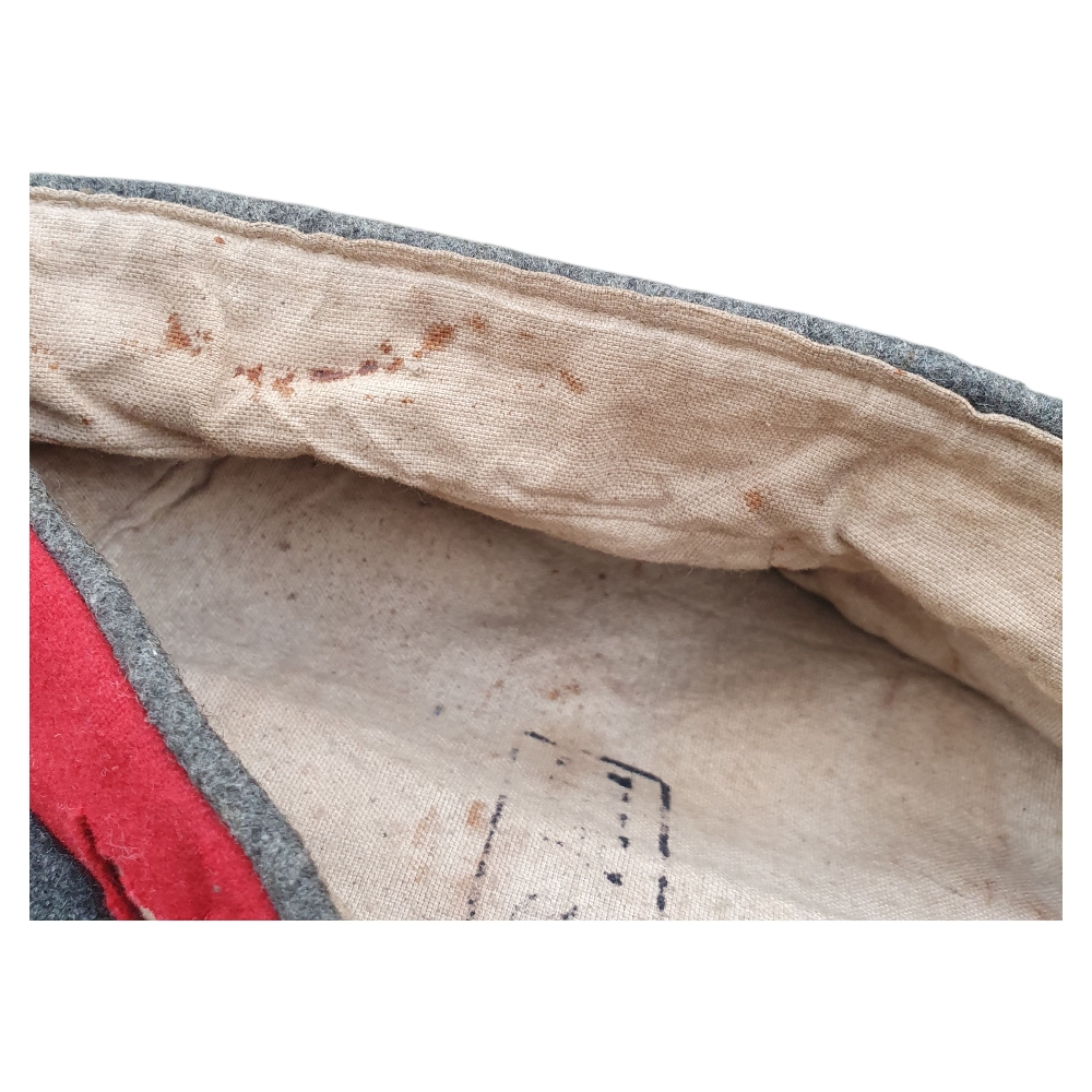 Inside, the cap retains its original depot or unit stamp, though it is partially faded and difficult to read due to age. The wool body shows 2–3 small moth holes and honest service wear, consistent with a century-old piece.