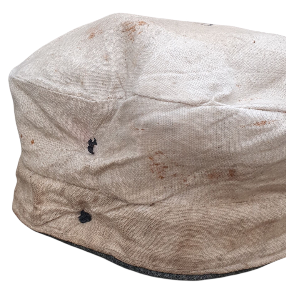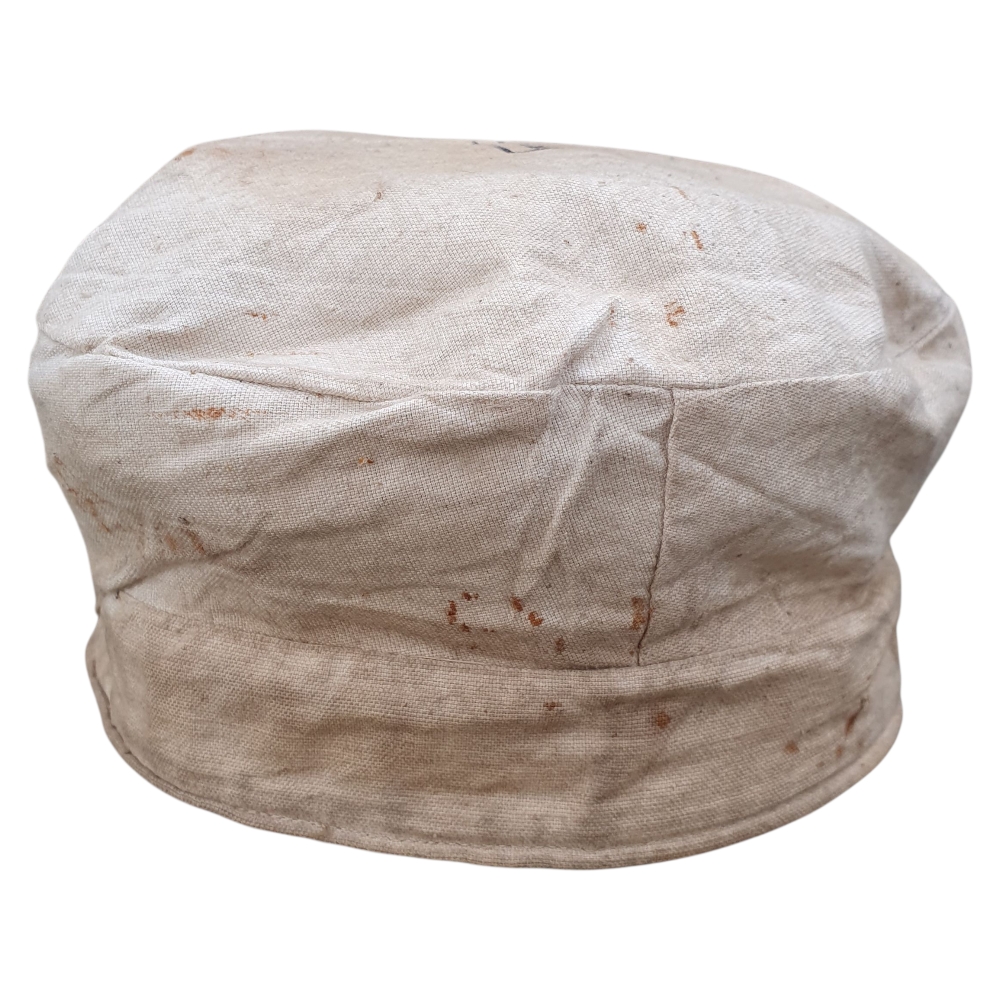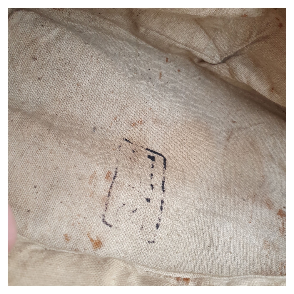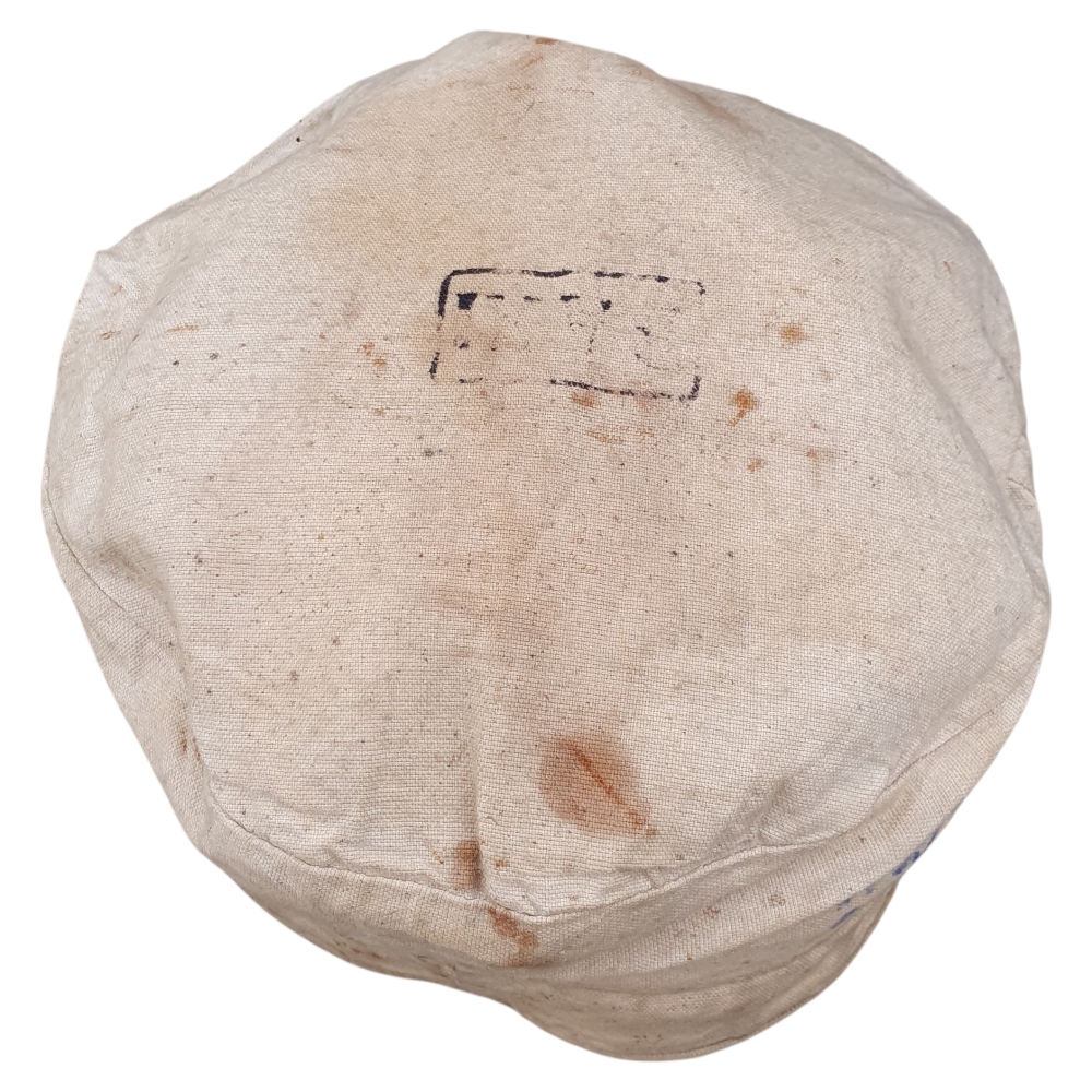 Inside, the cap retains its original depot or unit stamp, though it is partially faded and difficult to read due to age. The wool body shows 2–3 small moth holes and honest service wear, consistent with a century-old piece.
