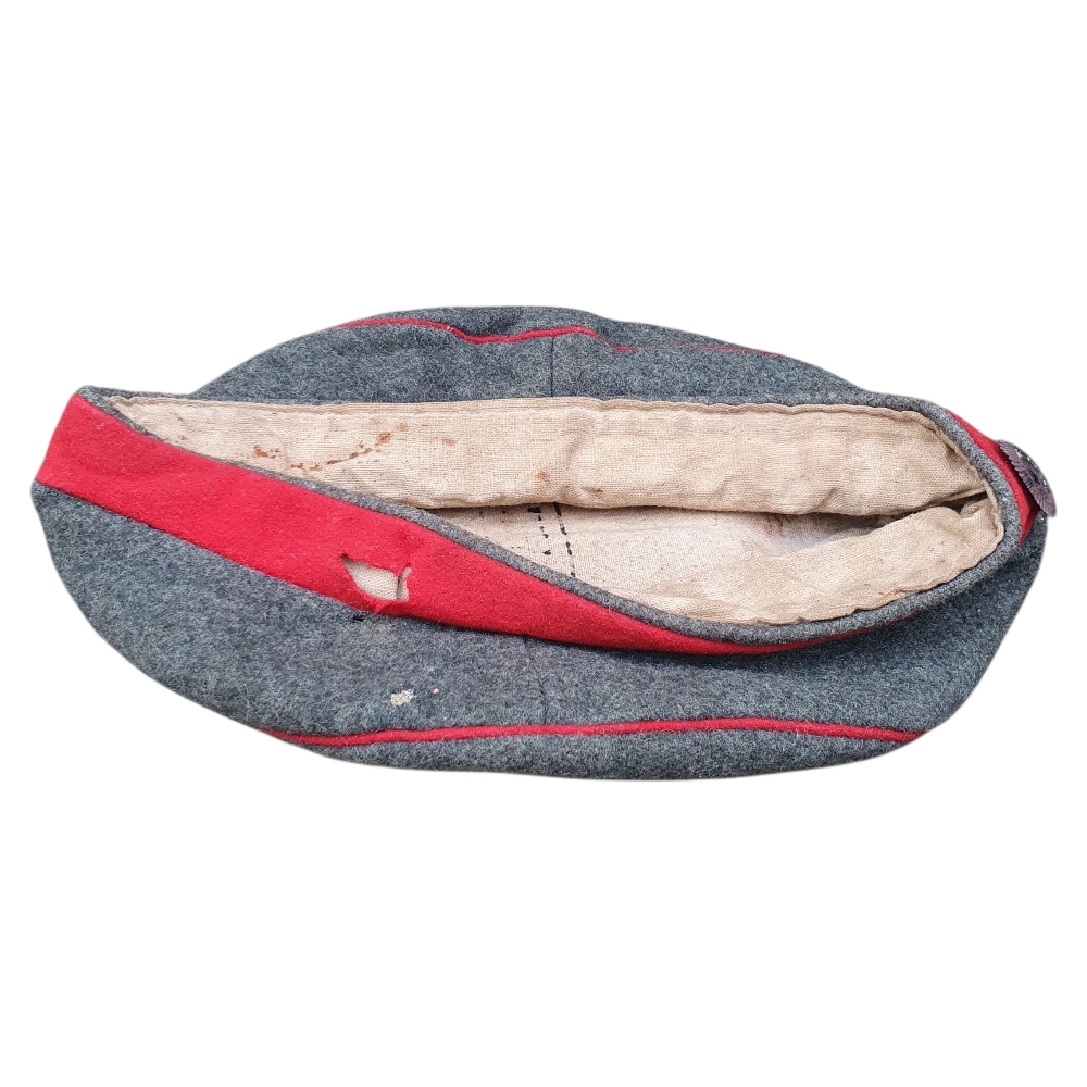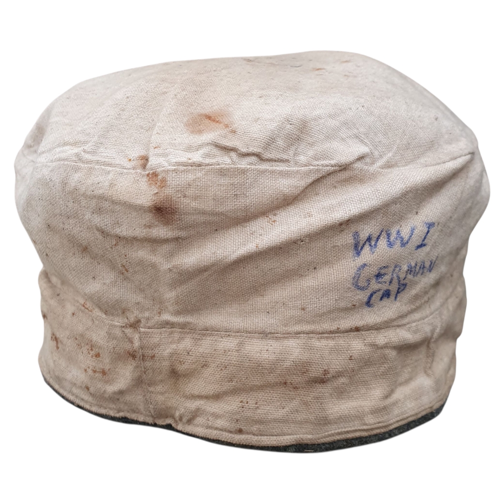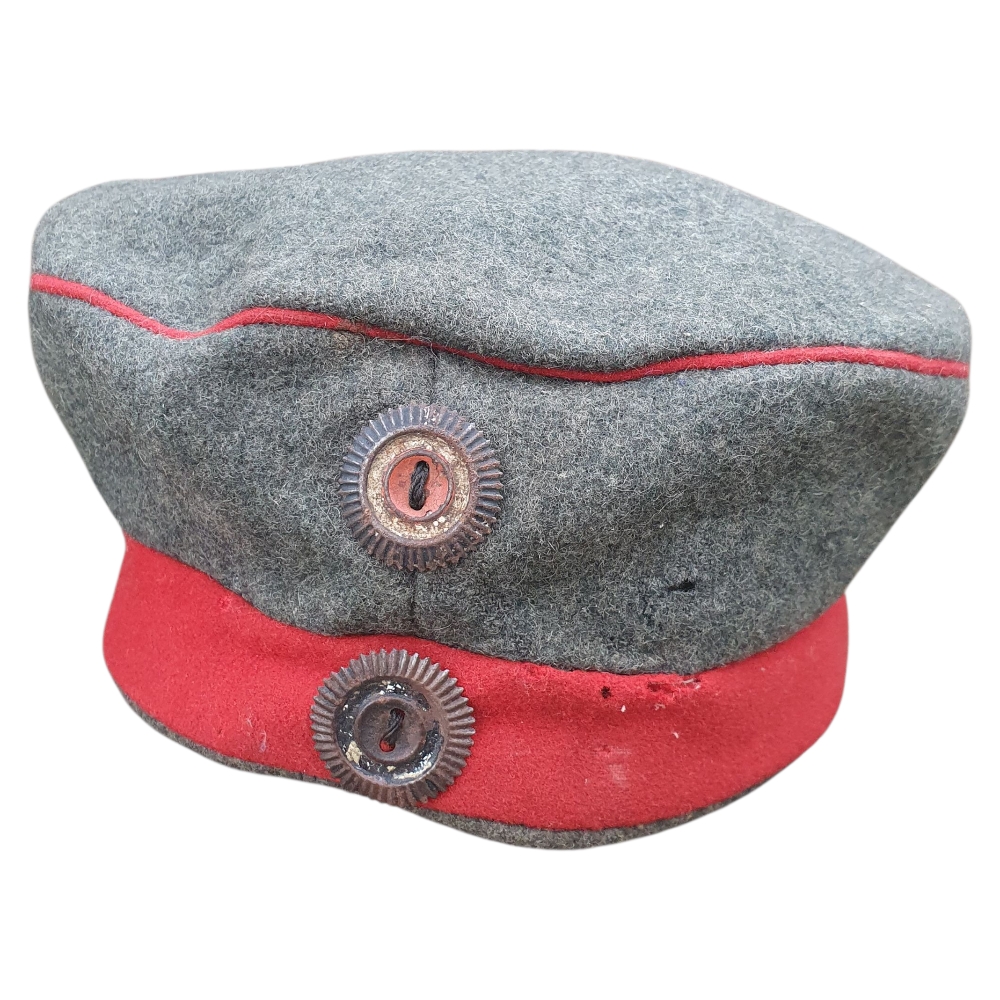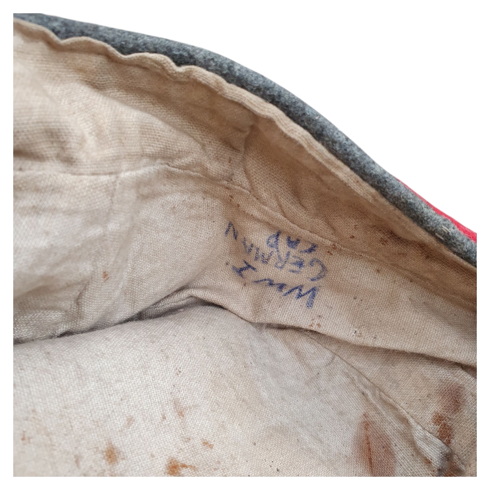 This is an authentic German Prussian WWI Mütze (field cap) from the First World War (1914–1918) — a genuine artifact of the Imperial German Army. Constructed in classic field-gray wool with colored band and piping, this cap represents the standard issue worn by Prussian enlisted soldiers during the Great War.