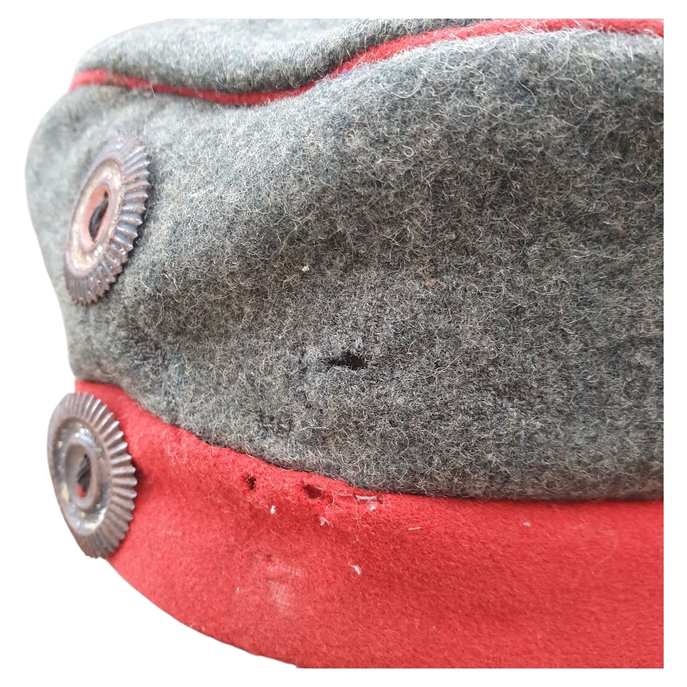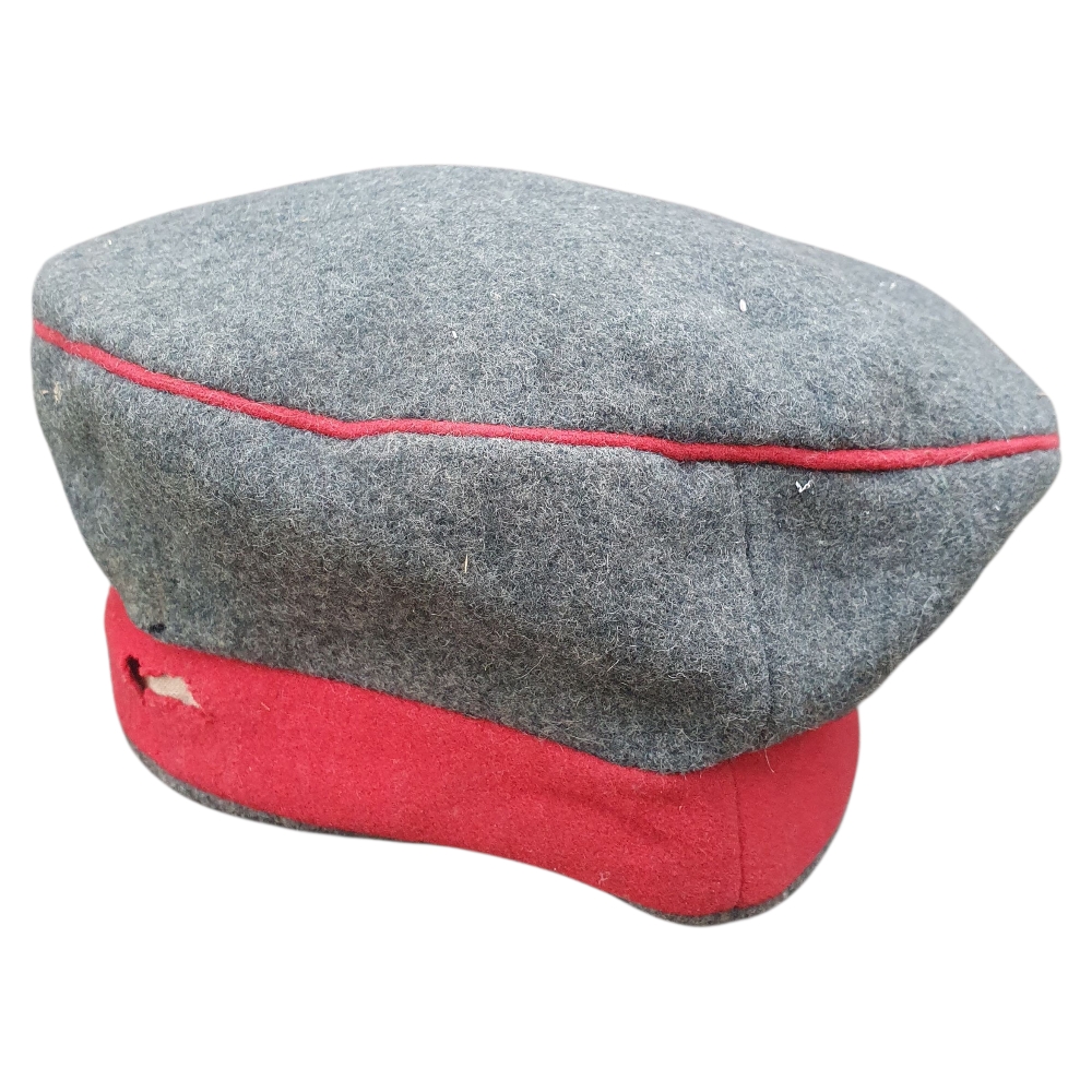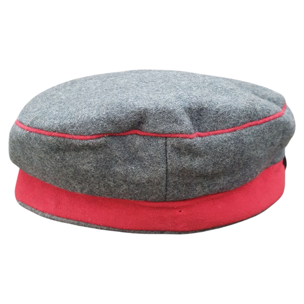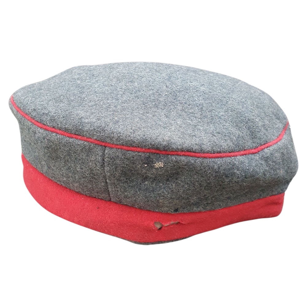 This is an authentic German Prussian WWI Mütze (field cap) from the First World War (1914–1918) — a genuine artifact of the Imperial German Army. Constructed in classic field-gray wool with colored band and piping, this cap represents the standard issue worn by Prussian enlisted soldiers during the Great War.