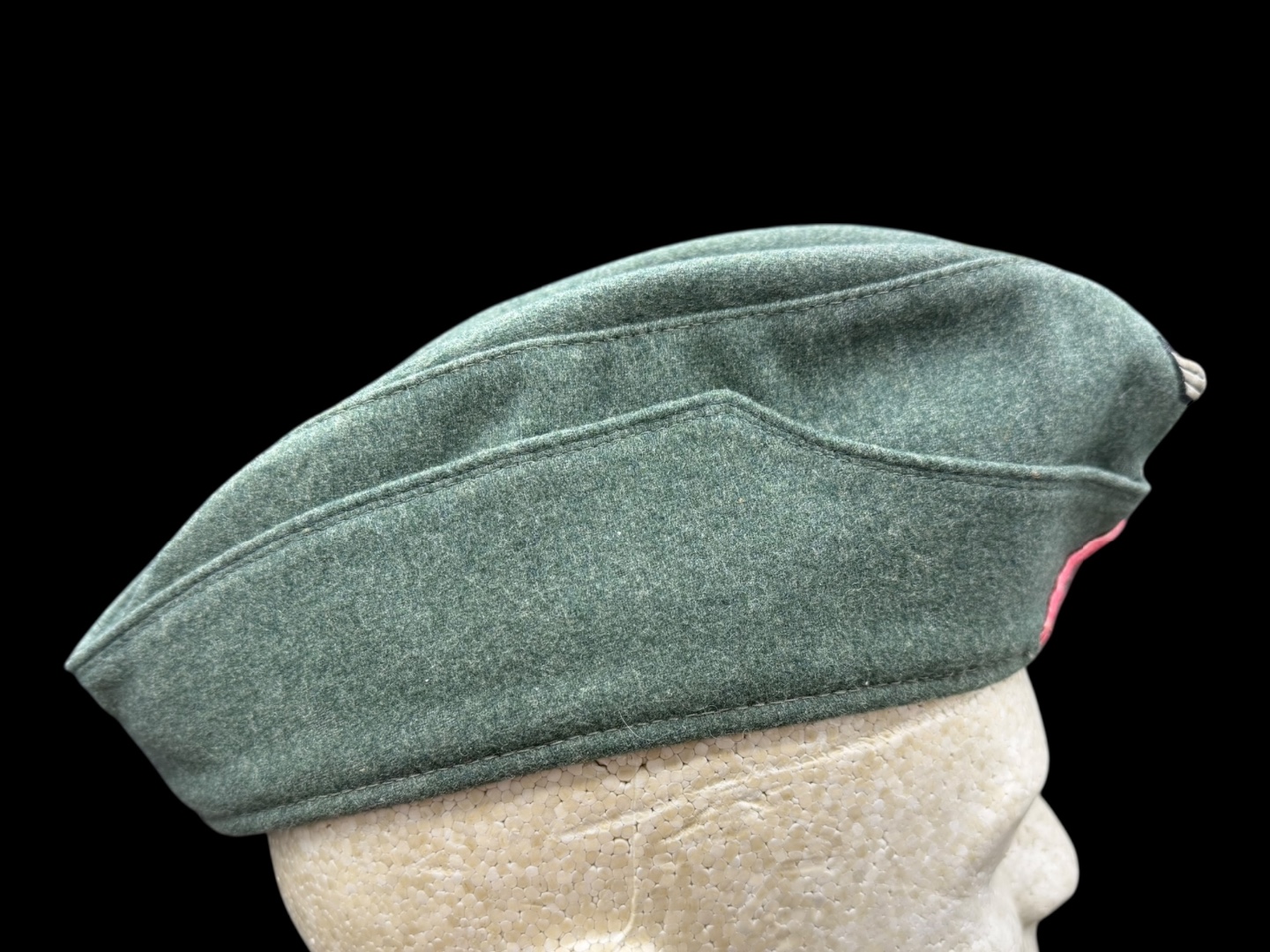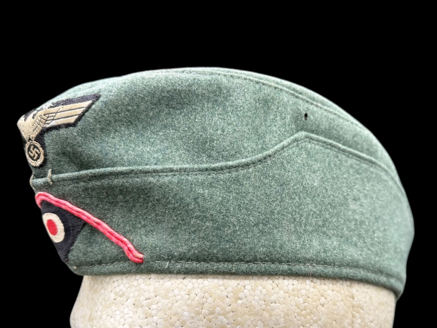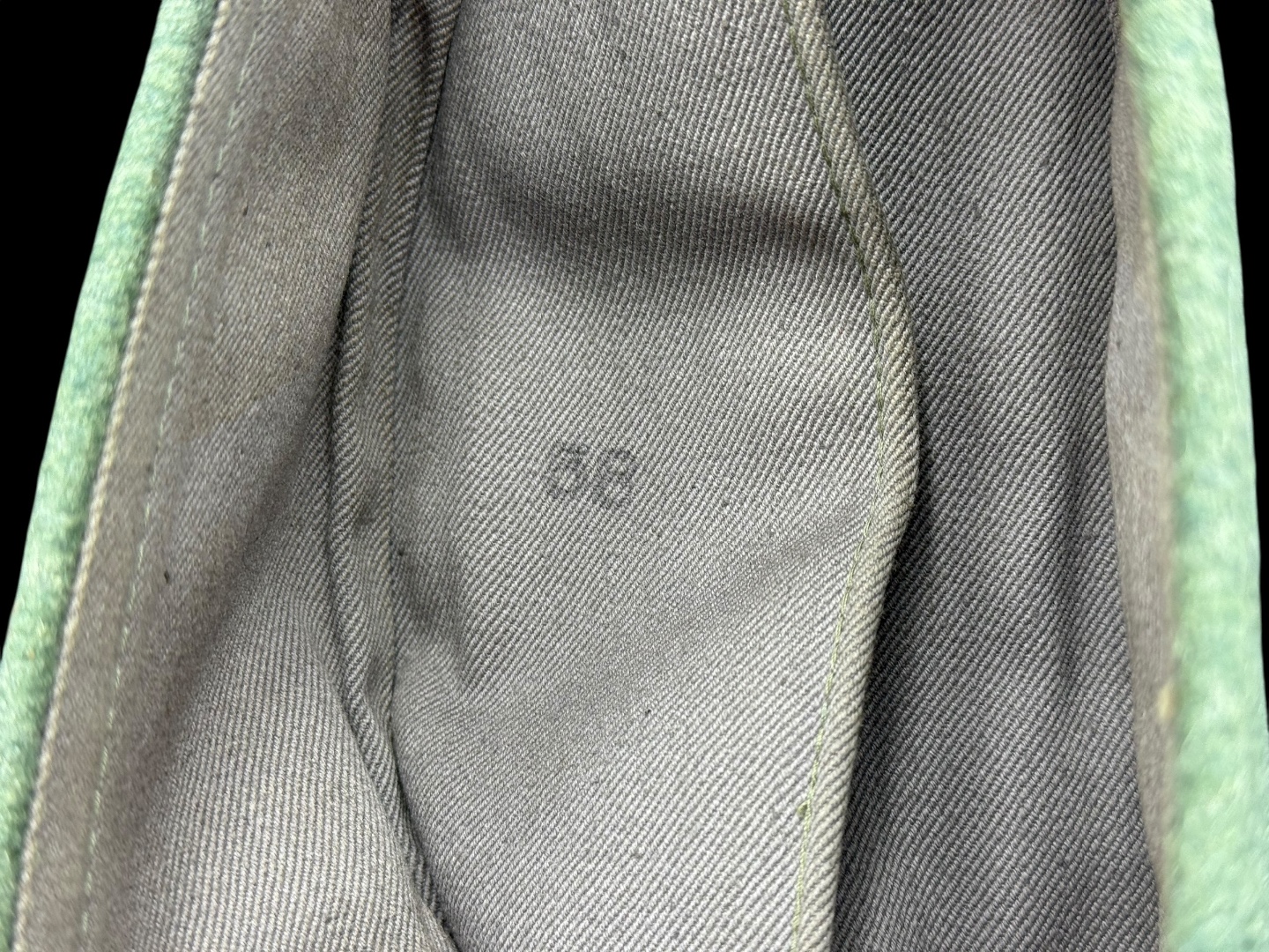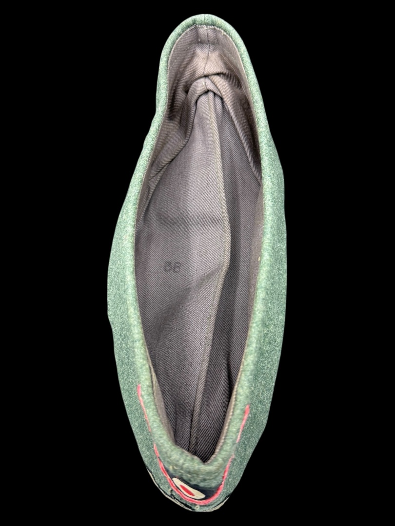 For sale is a nice condition field gray panzer overseas cap, size 58. Other than a single hole (possible moth snack) the cap is in great shape with pink piping in tact, signs of sweat and use in the liner but not a lot of wear on the wool nap.
