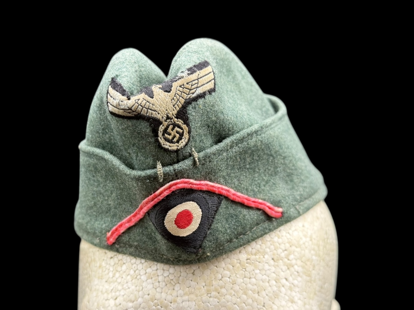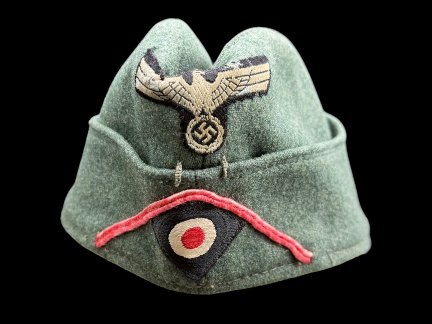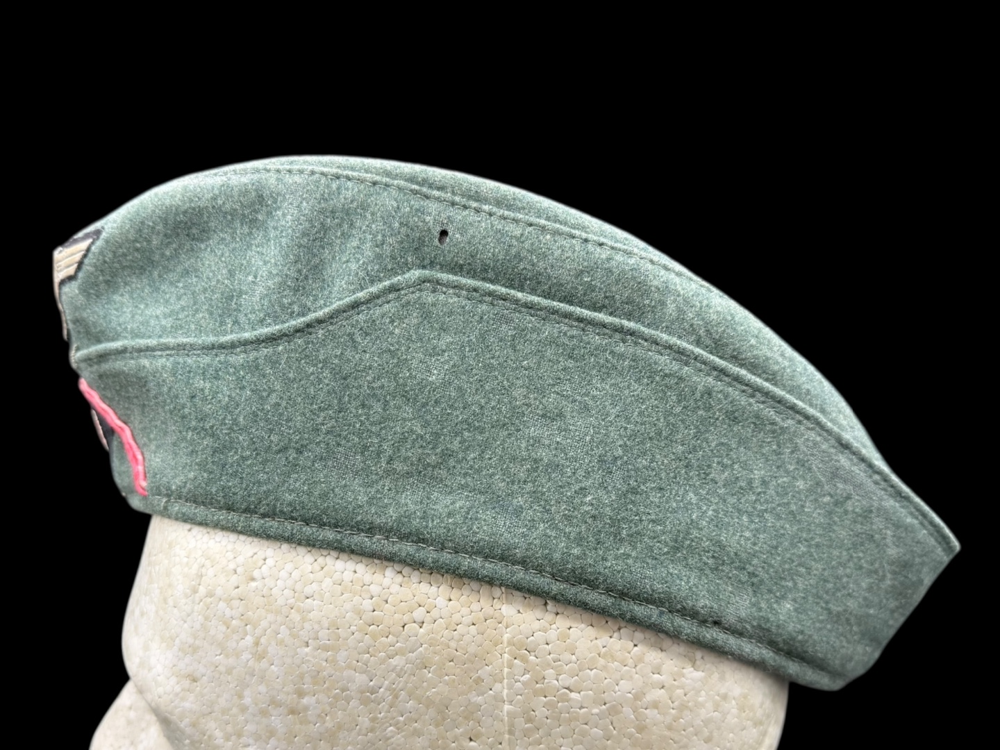 For sale is a nice condition field gray panzer overseas cap, size 58. Other than a single hole (possible moth snack) the cap is in great shape with pink piping in tact, signs of sweat and use in the liner but not a lot of wear on the wool nap.