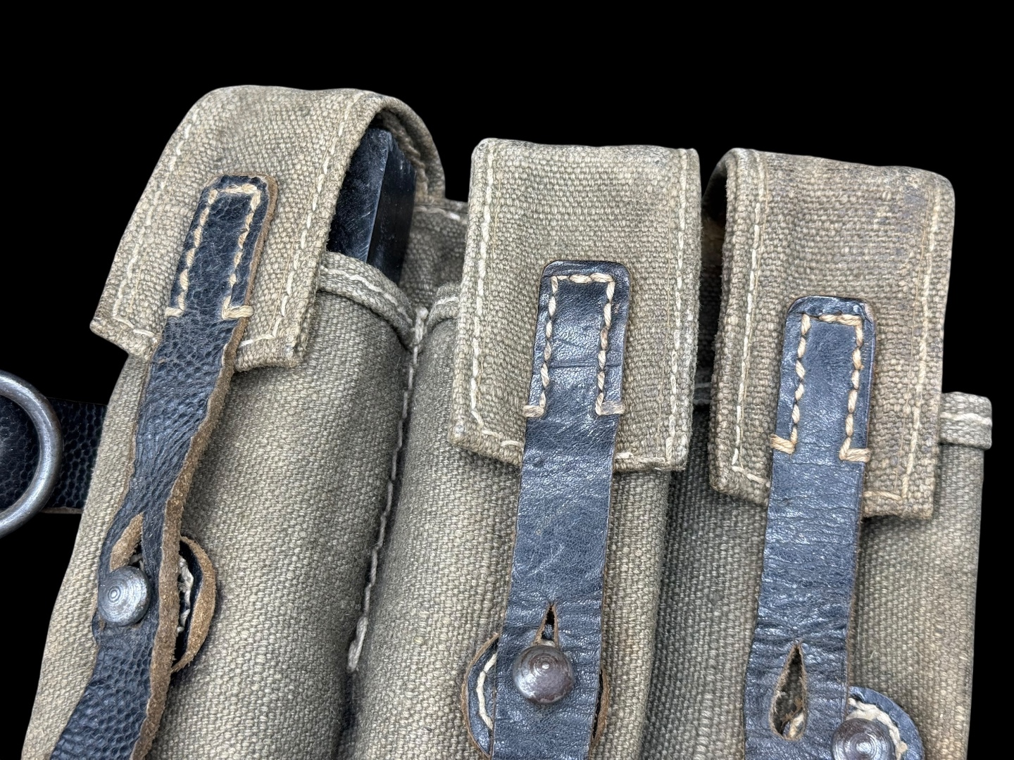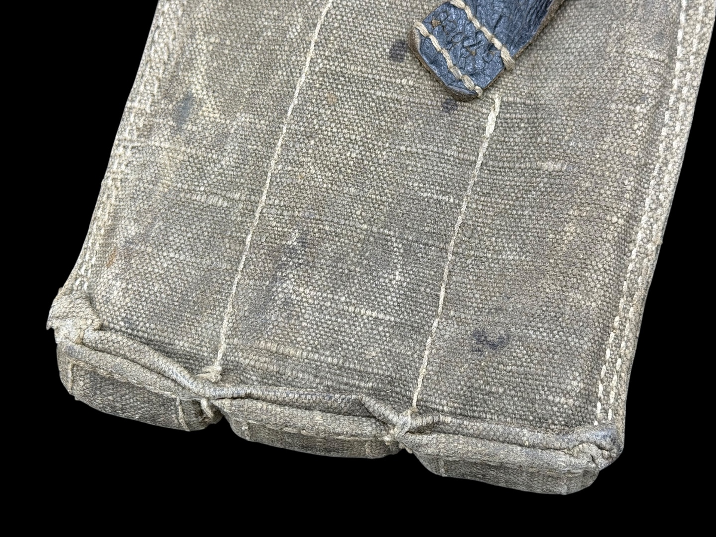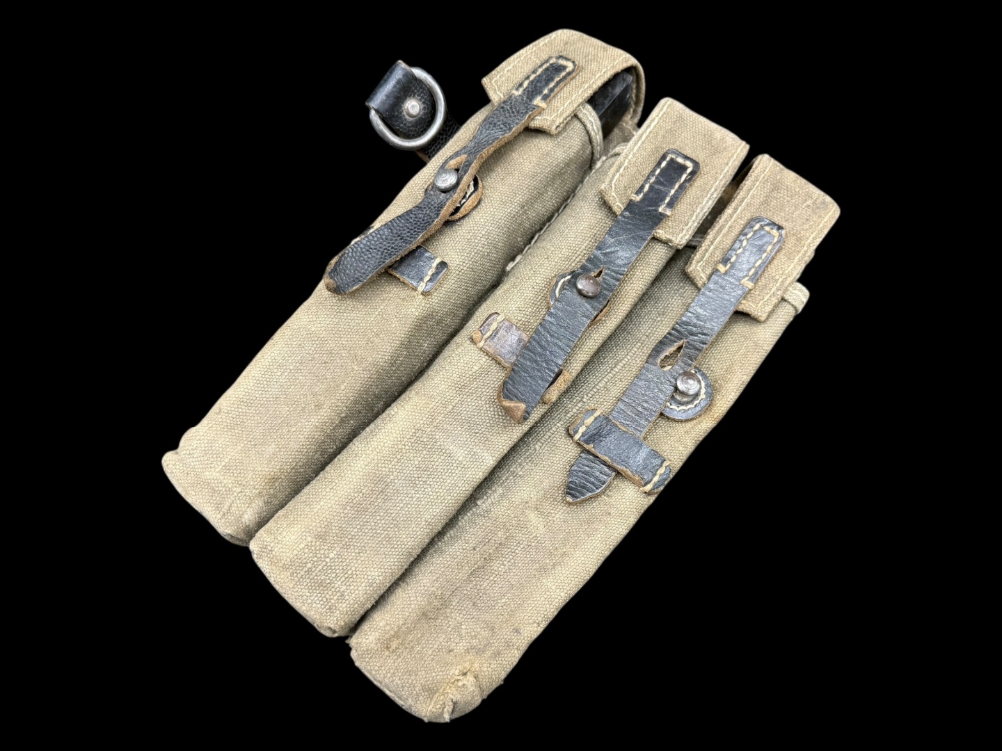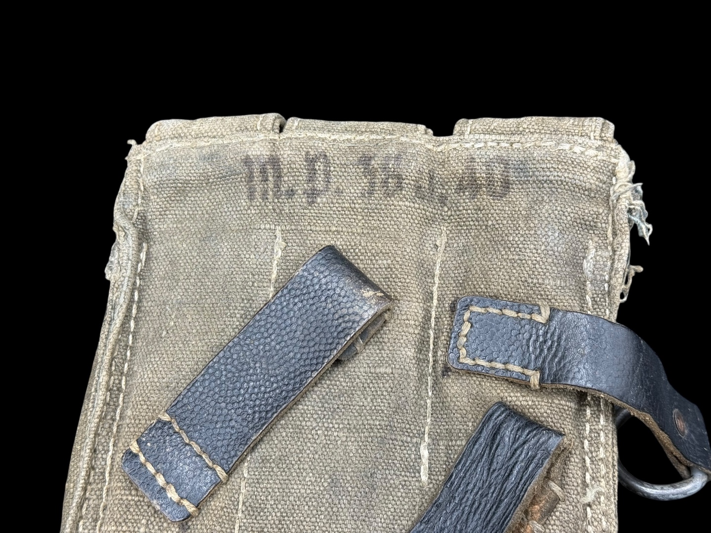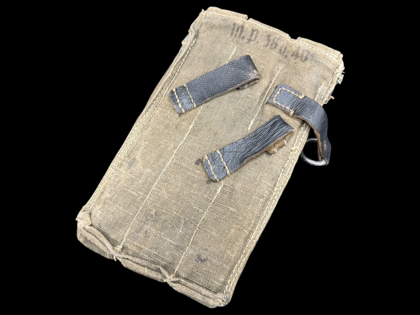 For sale is a 3-cell MP38/MP40 mag pouch in good condition, maker marked “ged” dated 1943. Canvas is clean and fully in tact, as are the leather straps while showing good amounts of use.