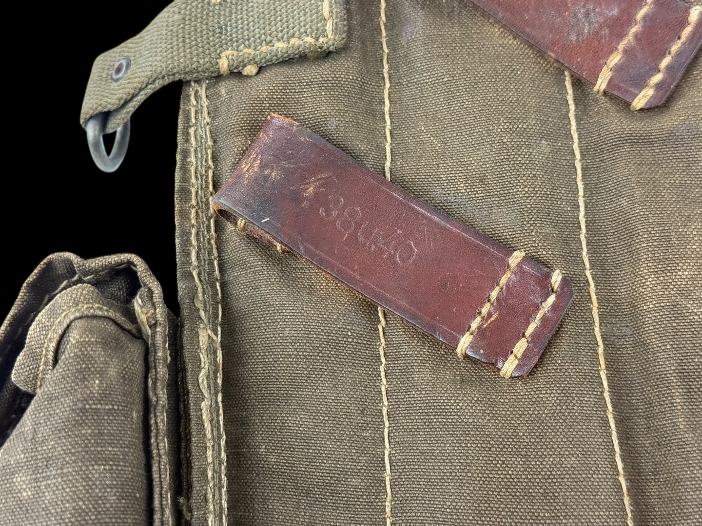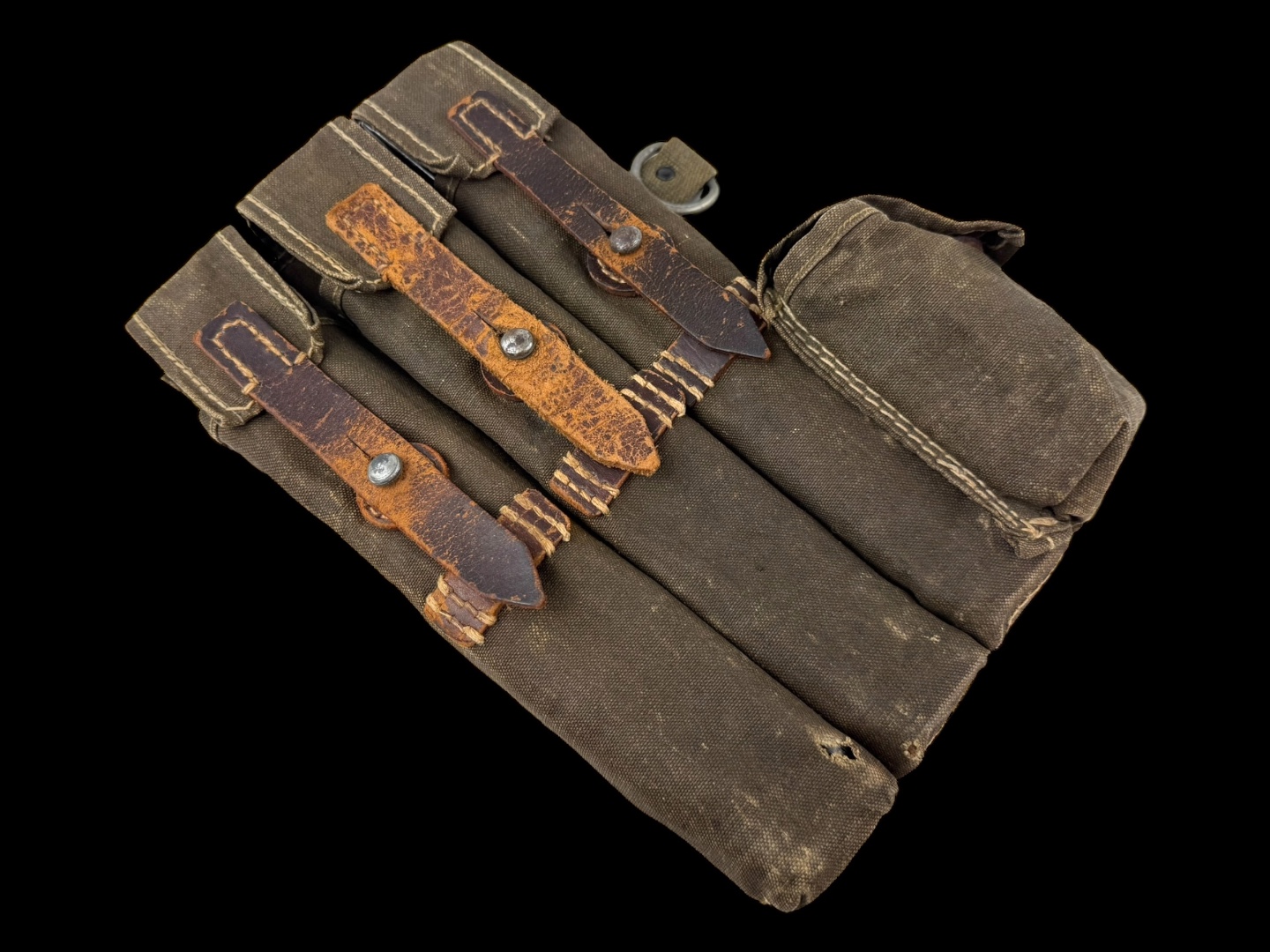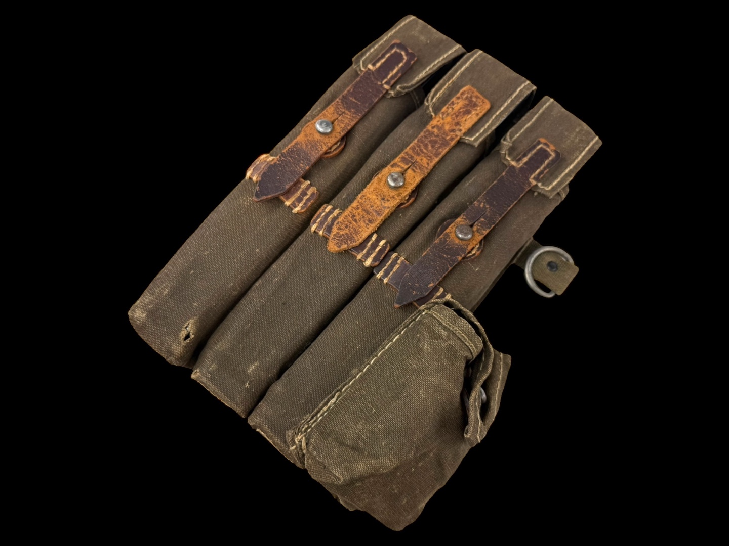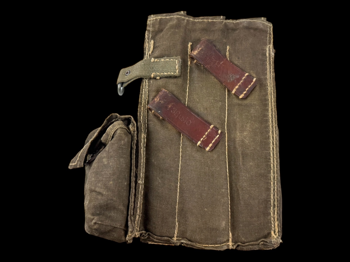 For sale is an original 3-cell MP38/MP40 magazine & mag loader pouch, maker marked “sd” dated 1942. The leather straps and canvas are in tact with little damage or wear while showing signs of good hard use.