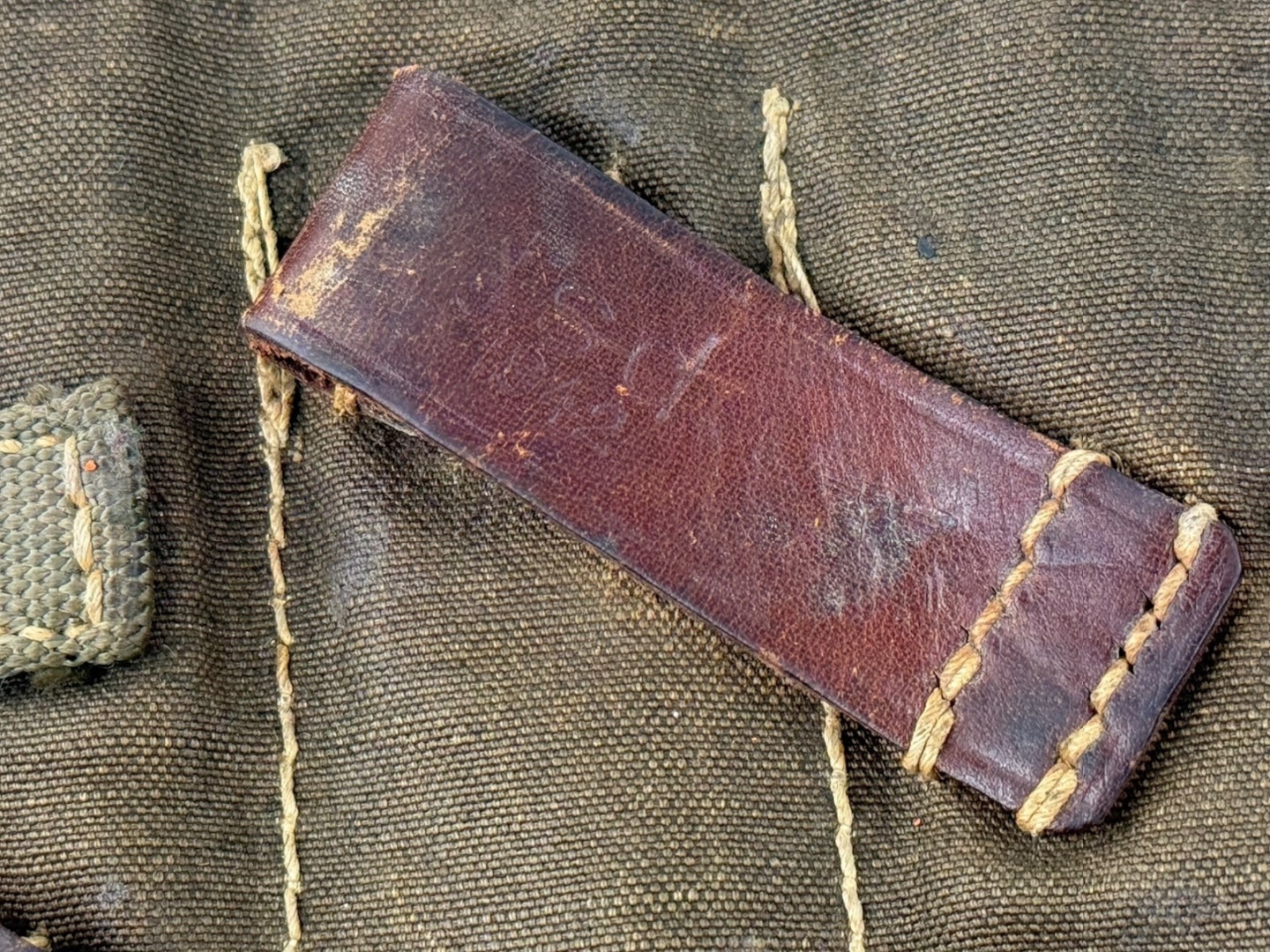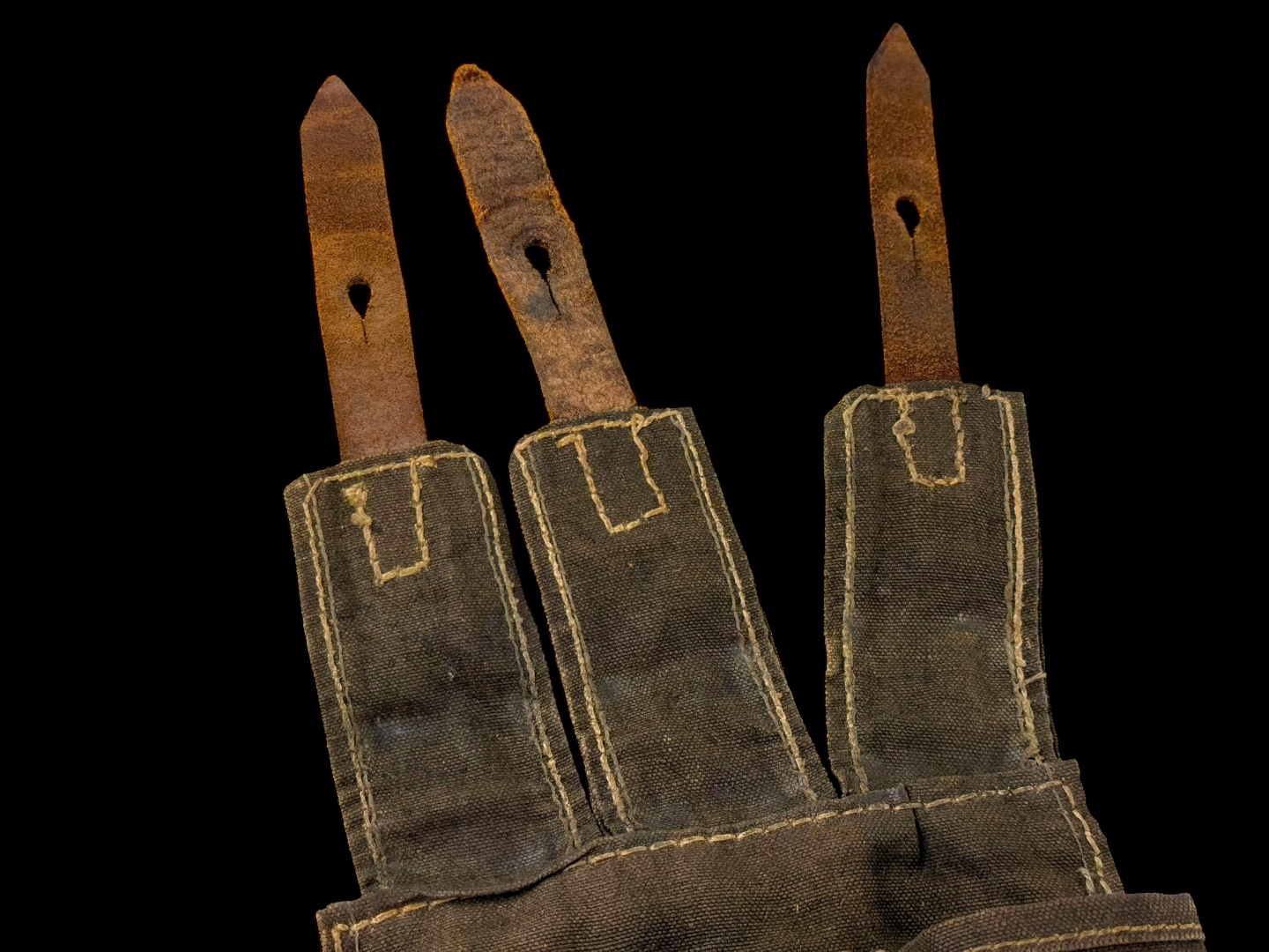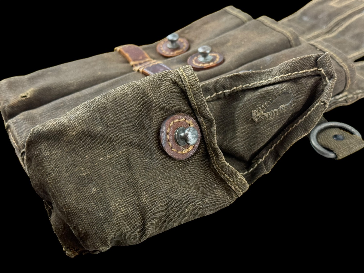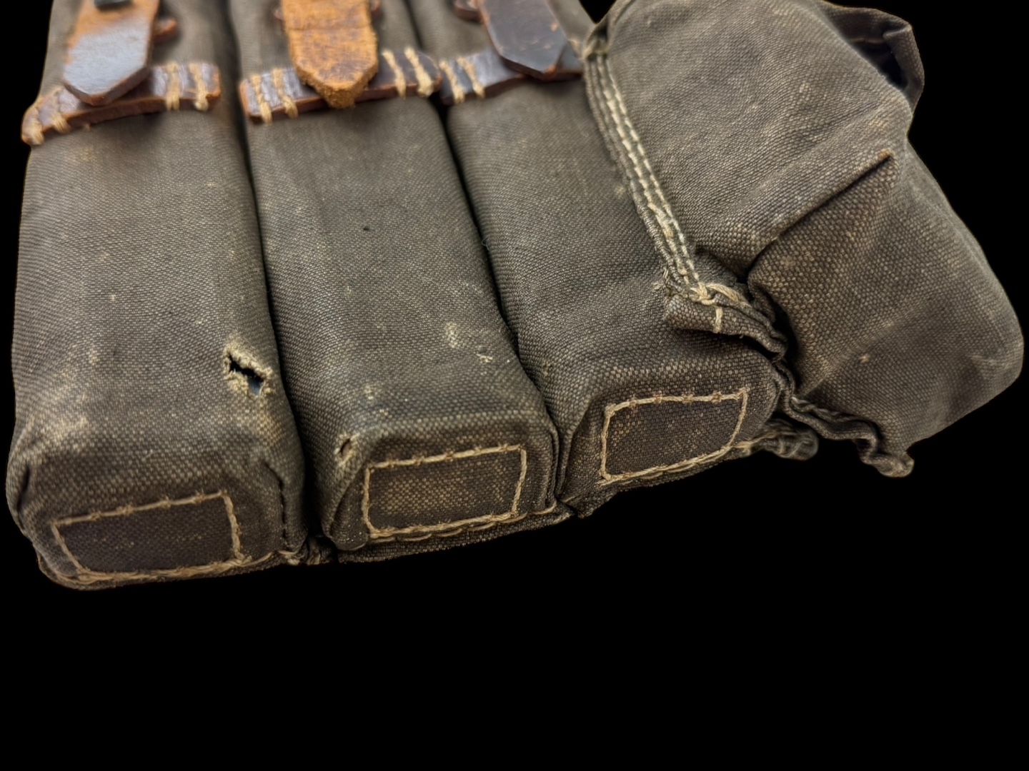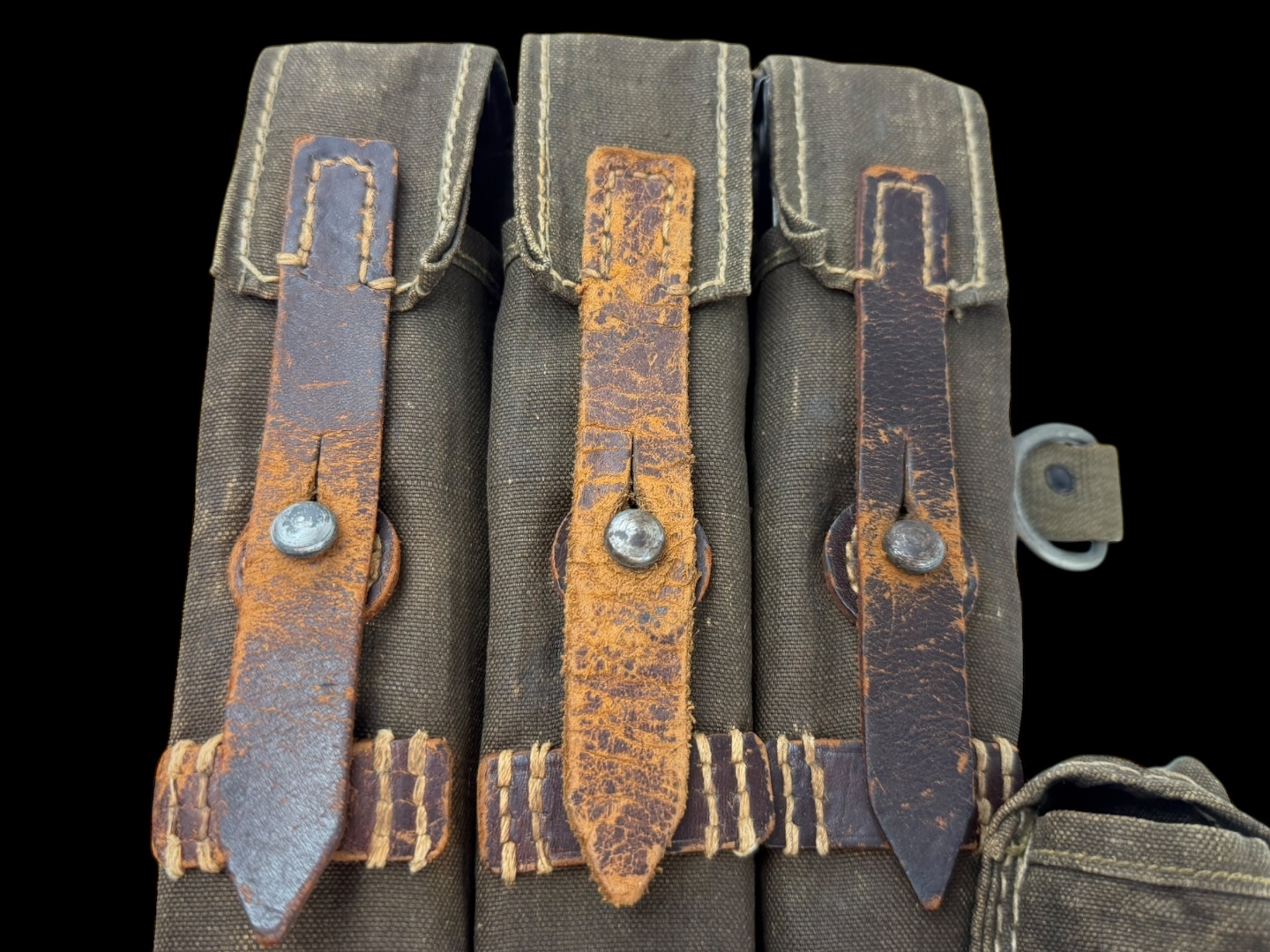 For sale is an original 3-cell MP38/MP40 magazine & mag loader pouch, maker marked “sd” dated 1942. The leather straps and canvas are in tact with little damage or wear while showing signs of good hard use.
